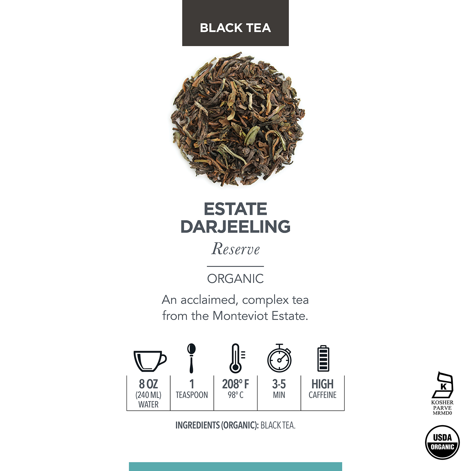 Teabloom’s Estate Darjeeling Reserve is a single-origin black tea made with only the freshest, premium quality tea leaves. USDA Certified Organic, EU Certified Organic and Certified Kosher.