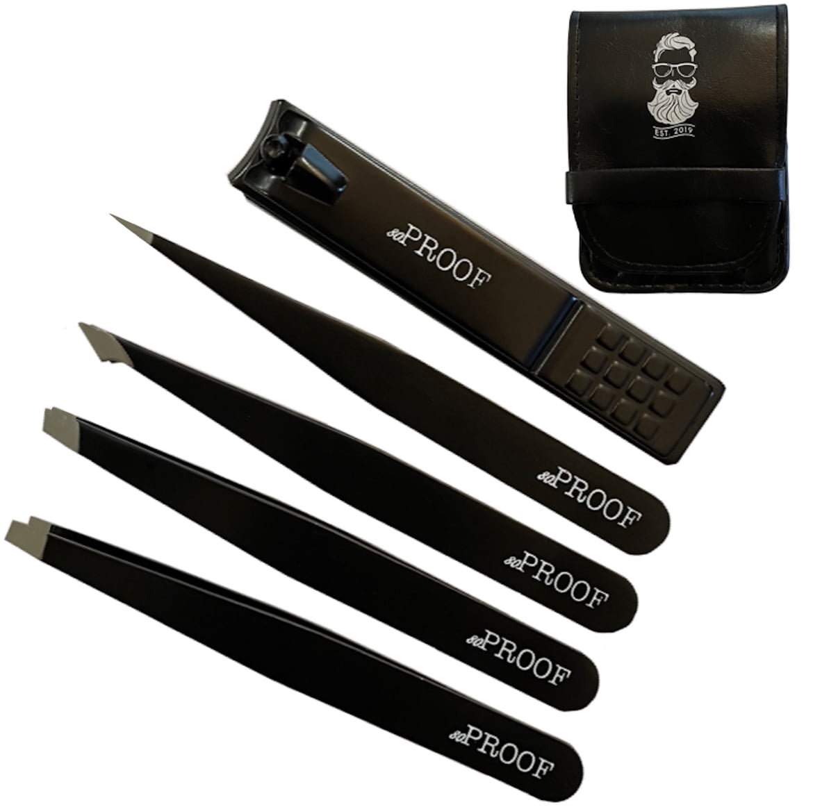 Tweezers & Nail Clipper 5 Piece Set – Professional Carbon Steel Slanted Tip and Pointed, Great Precision Tweezers with Tool Pouch (Black)(5-Pack)
