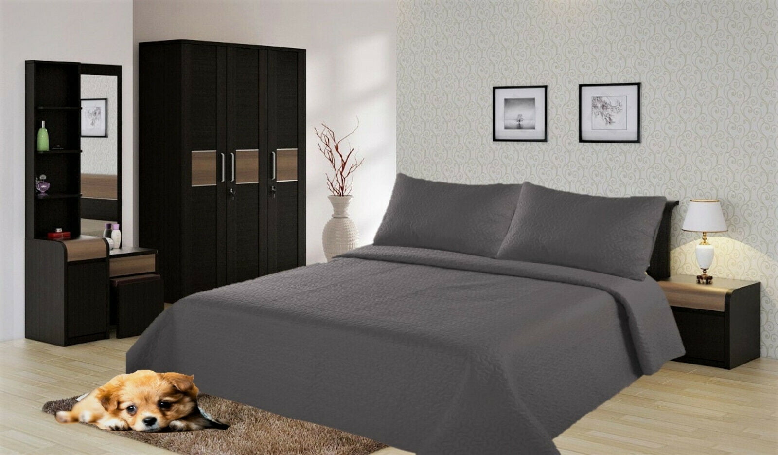 TWIN NENA GREY Solid Reversable Quilt Set Stippling Stitches Pattern Comfort Bedspread Bedroom Bedding Dressing