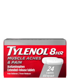 TYLENOL 8 HR Muscle Aches Pains provides strong and fast pain relief. Containing 650 milligrams of acetaminophen, this pain reliever and fever reducer act fast to help relieve minor aches and pains for up to eight hours. TYLENOL Muscle Aches Pains are tough on body pain but gentle on your stomach. It is safe and effective when used as directed.