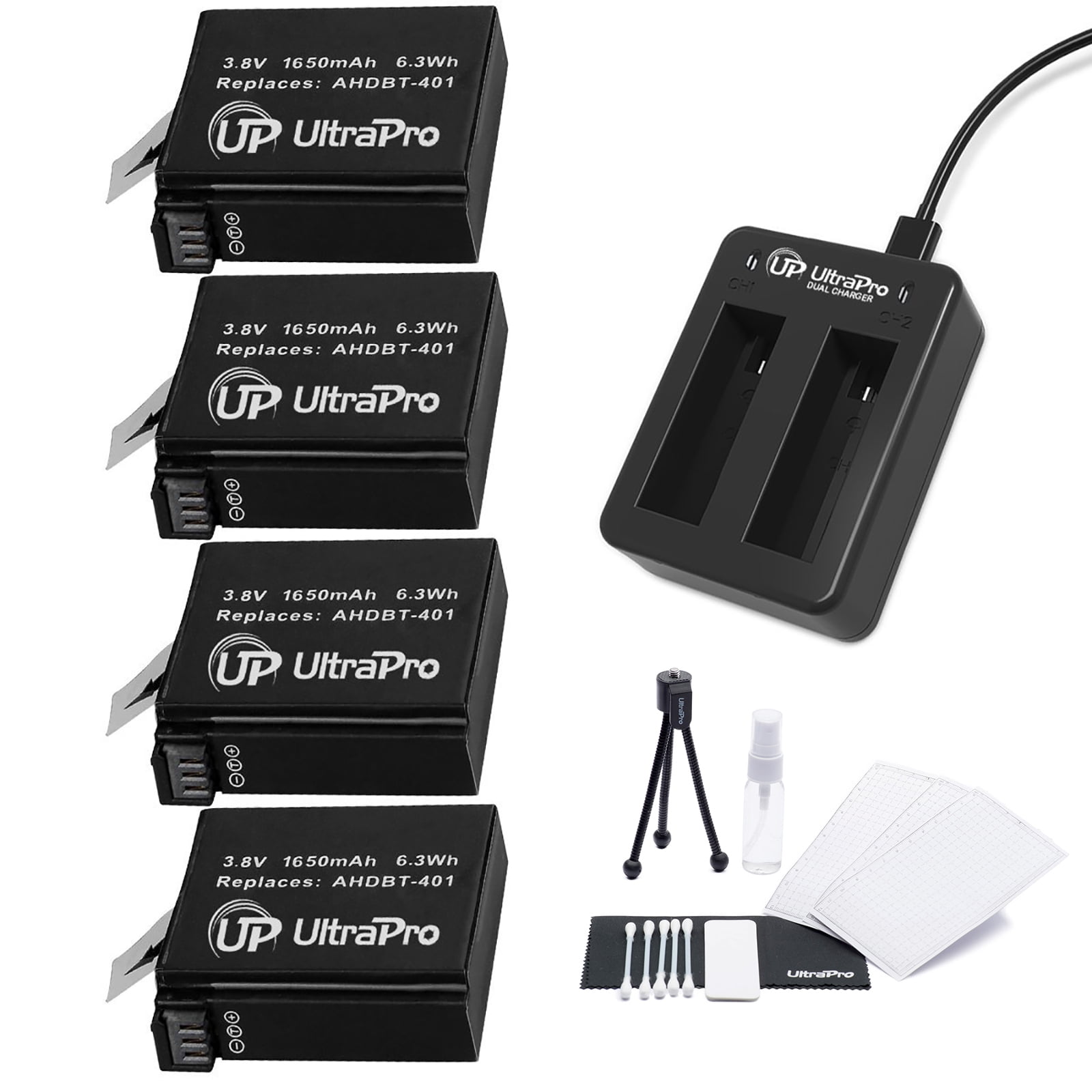 UltraPro 4-Pack AHDBT-401 High-Capacity Replacement Batteries with Rapid Dual Charger for GoPro Hero4. Also Includes: Camera Cleaning Kit, Camera Screen Protector, Mini Travel Tripod