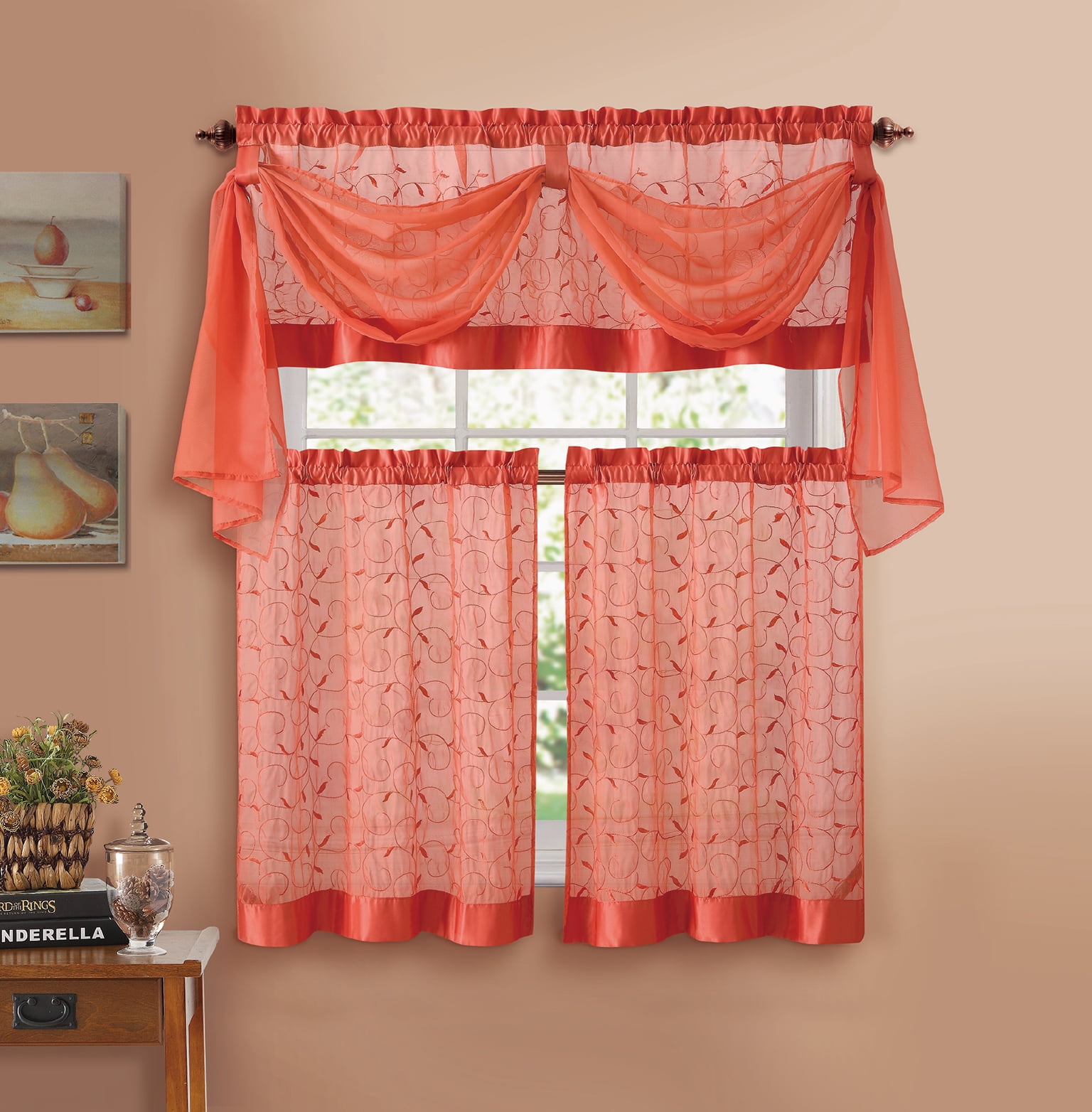 Victoria Classics Linen Leaf Embroidered Kitchen Curtain Set – Assorted ColorsLinen Leaf Kitchen Curtain Set comes as a 4 piece set (2 Tiers, 1 Valance & 1 Scarf)Valance measure 60" wide by 18" longTiers measure 60" wide by 36" longMaterial is made of 100% PolyesterDelicate embroidery on crushed sheer and matching scarf add a touch of sophistication and class to any kitchen window.VCNY Home Linen Leaf Embroidered Complete Kitchen Curtain Set – Orange