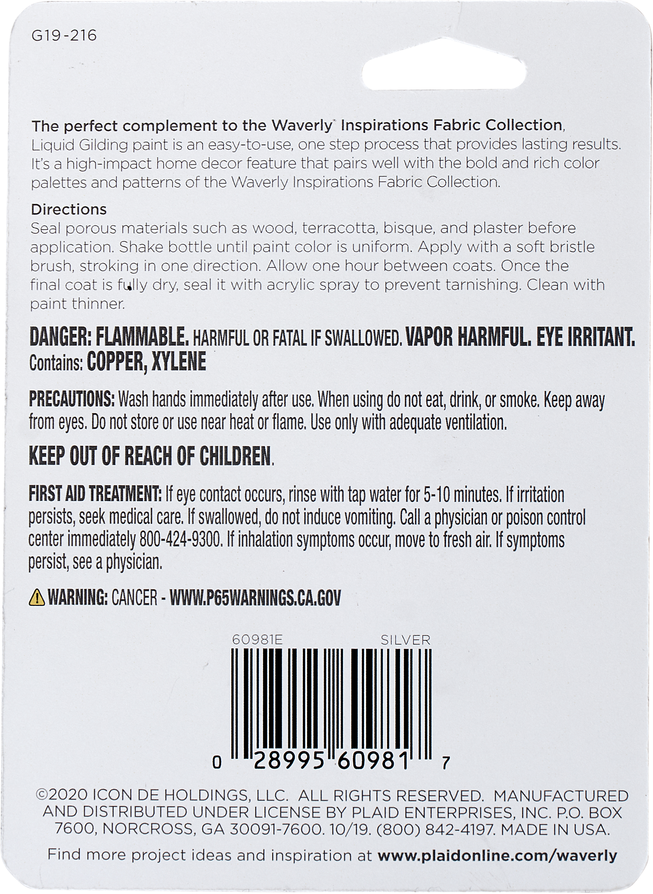 Waverly Inspirations .75 oz paints, brushes and stencils were inspired by the rich archives of stylish Waverly fabric designs and provide a fresh, yet classic vision for home decor. The Waverly Inspirations paints, brushes and stencils allow consumers to be artistic when creating tastefully coordinated home decor and DIY projects. Whether you are a beginner or an experienced crafter, Waverly Inspirations offers something for everyone. The Waverly Inspirations Silver Liquid Gilding will add a stunning shimmer of silver to all your projects. This liquid silver bottle of paint is perfect for adding accents to your glassware, canvas paintings, and home decor projects. With every brushstroke, this one-step leafing paint creates a rich metallic luster as beautiful as precious metal. Add some brilliant shine to your projects with the Waverly Inspirations Silver Liquid Gilding. A soft bristle brush is recommended for the smoothest finish. This product is intended for indoor use only – outdoor elements may tarnish or dull the finish.
