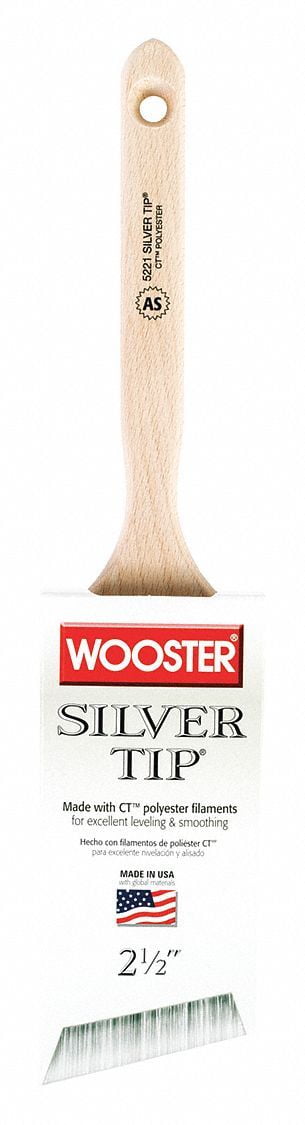 The WOOSTER Silver Tip brush features white and silver CT polyester filaments for excellent leveling and smoothing with all paints. Soft formulation delivers featherlike strokes virtually eliminating visible brush strokes. Durable stainless steel ferrule on a birch hardwood handle.Wooster 2-1/2" Angle Sash Polyester Paint Brush, Soft, for All Paints and Coatings, 1 EA – 5221-2 1/2