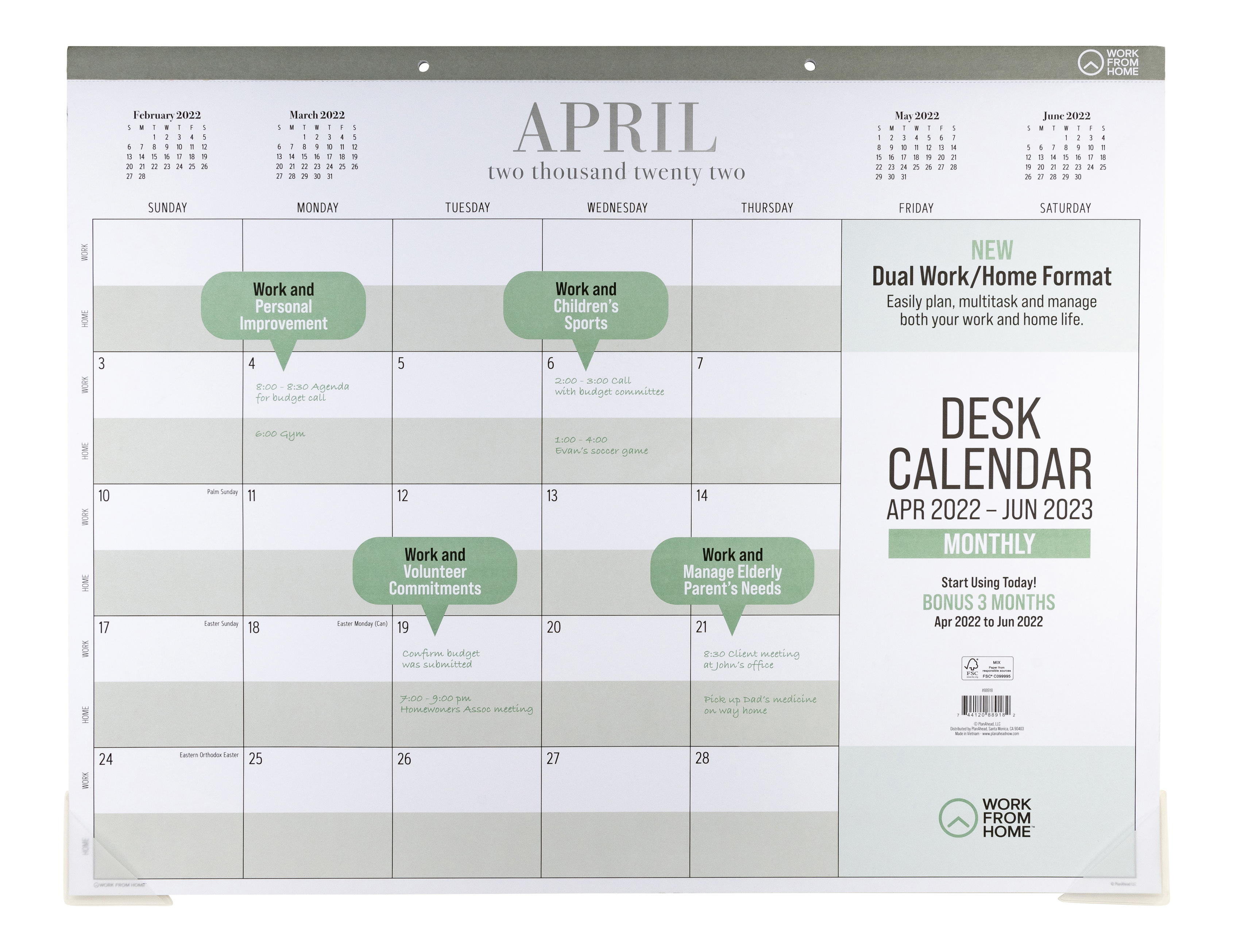 The Work From Home desk pad calendar is the ultimate planning tool for the professional, student, and casual user alike. Have all of your necessary appointments, tasks and dates for both work and home life. Large, clearly marked daily dated spaces allow for ample room to write. It has individual monthly tear-away pages with large, easy-to-read print and high contrast white writing spaces. Dating covers 15 months from April 2022 – June 2023. Size: 11′ x 17"
