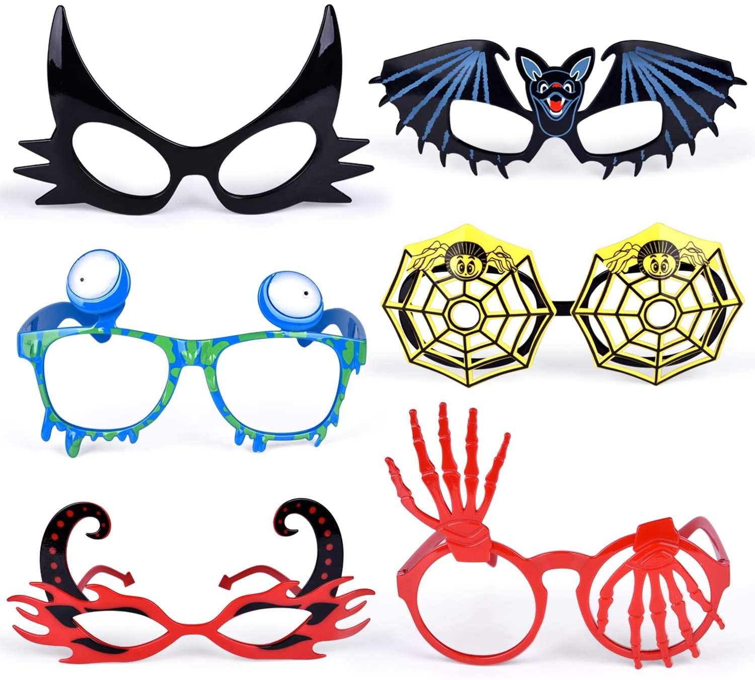 - 6 Pairs of various styles Halloween iconic spectacle frames, including bat, spider web, crab, skeleton hands, evil and black cat; one-size-fits-all.