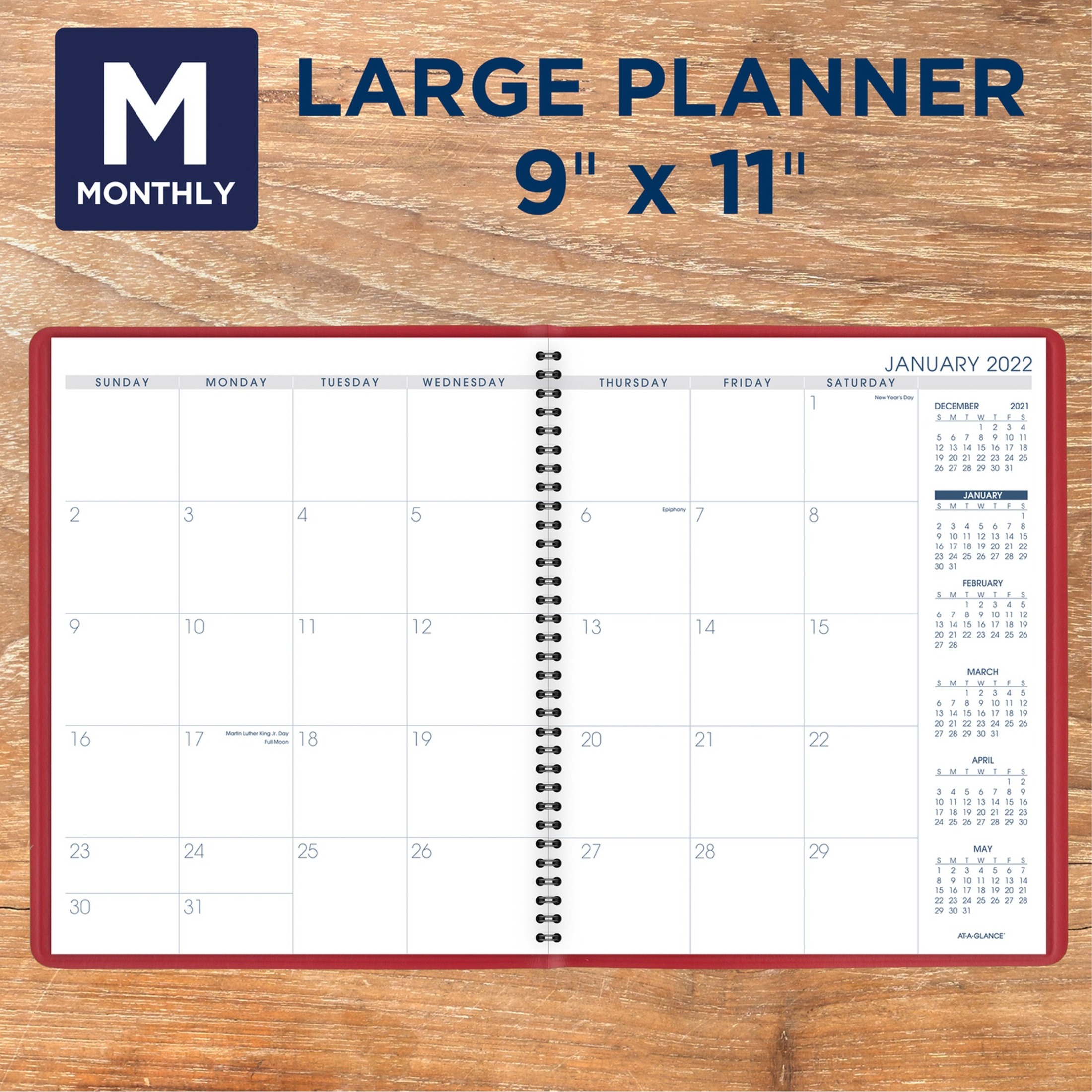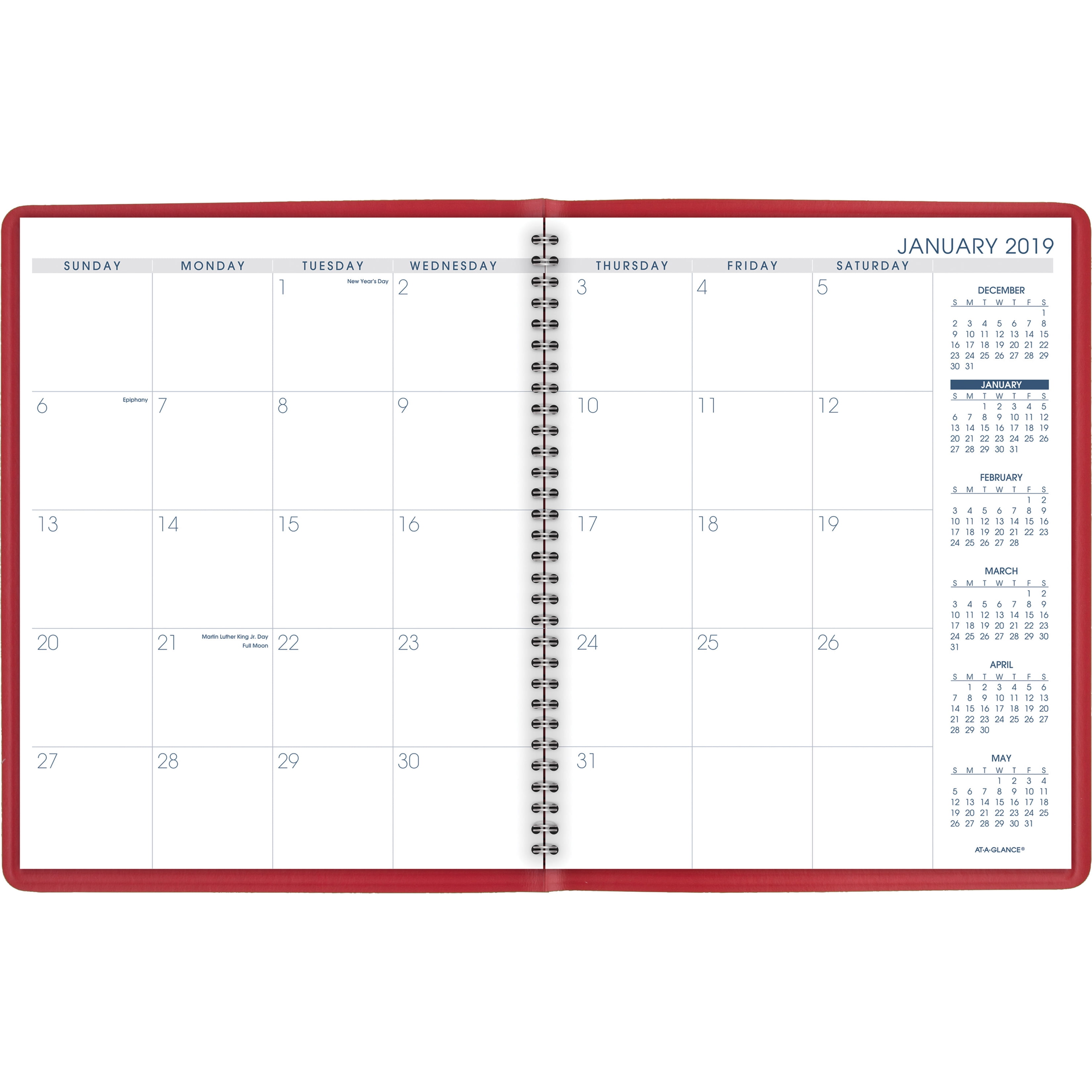 Monthly planner offers the scheduling basics you need with fashion color covers you want. Dated planning pages range 15 months from January to March. Two-page-per-month spreads include an upscale two-color format, unruled daily blocks, Sunday-through-Saturday scheduling, holidays, and past, current and four future months reference blocks in a column on the right. Wirebound appointment planner also offers a flexible, simulated leather cover. Planner is nonrefillable.