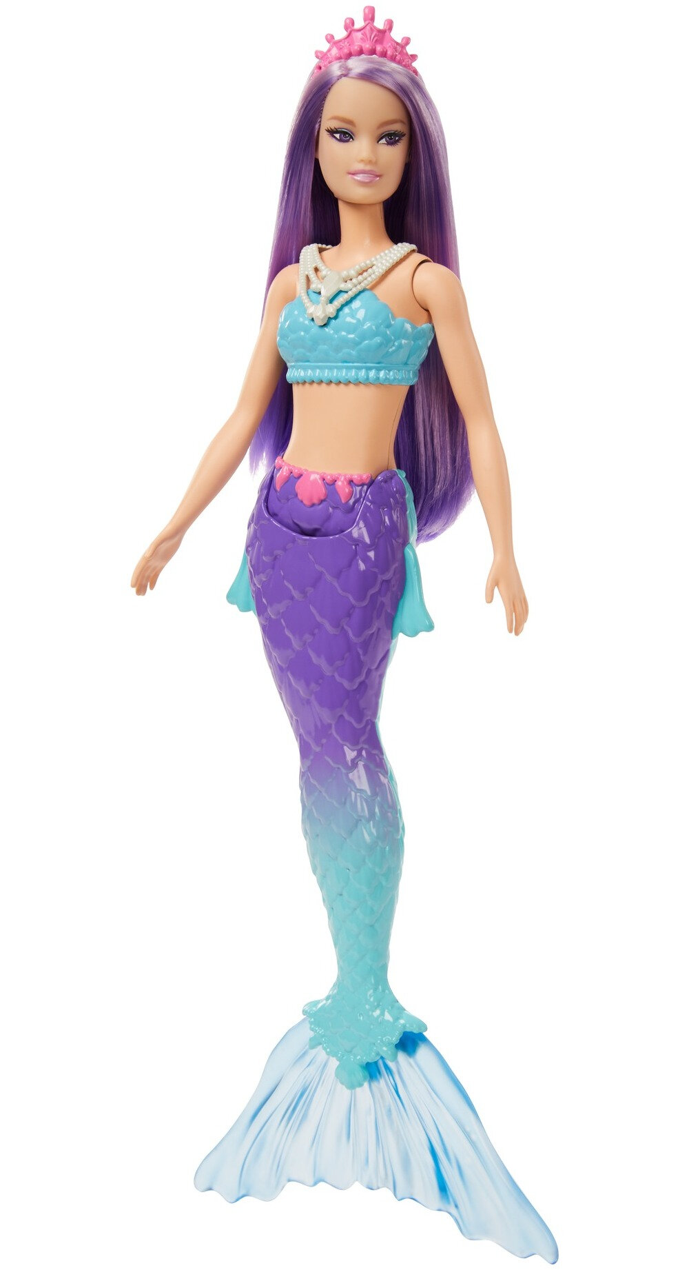 - Long, purple fantasy hair and a royal tiara complete Barbie doll’s magical mermaid look