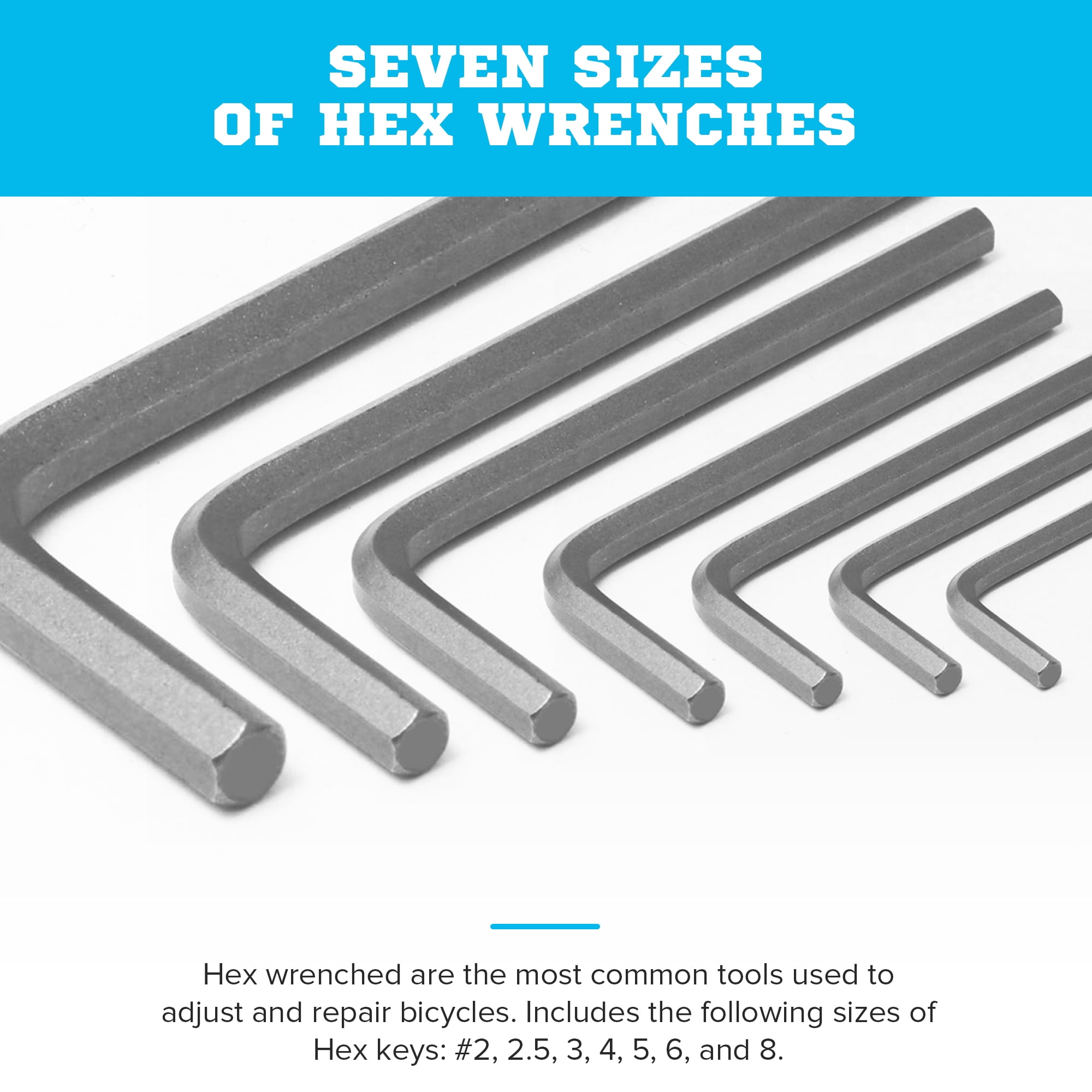Hex wrenches are the most commonly used tools for adjusting and repairing bicycles. With our bike tool kits, you can prepare to make necessary adjustments to the seat post and handlebars, tighten loose water bottle cages, and reattach loose accessories. This bicycle repair kit includes the following sizes of hex keys: #2, 2.5, 3, 4, 5, 6, and 8.