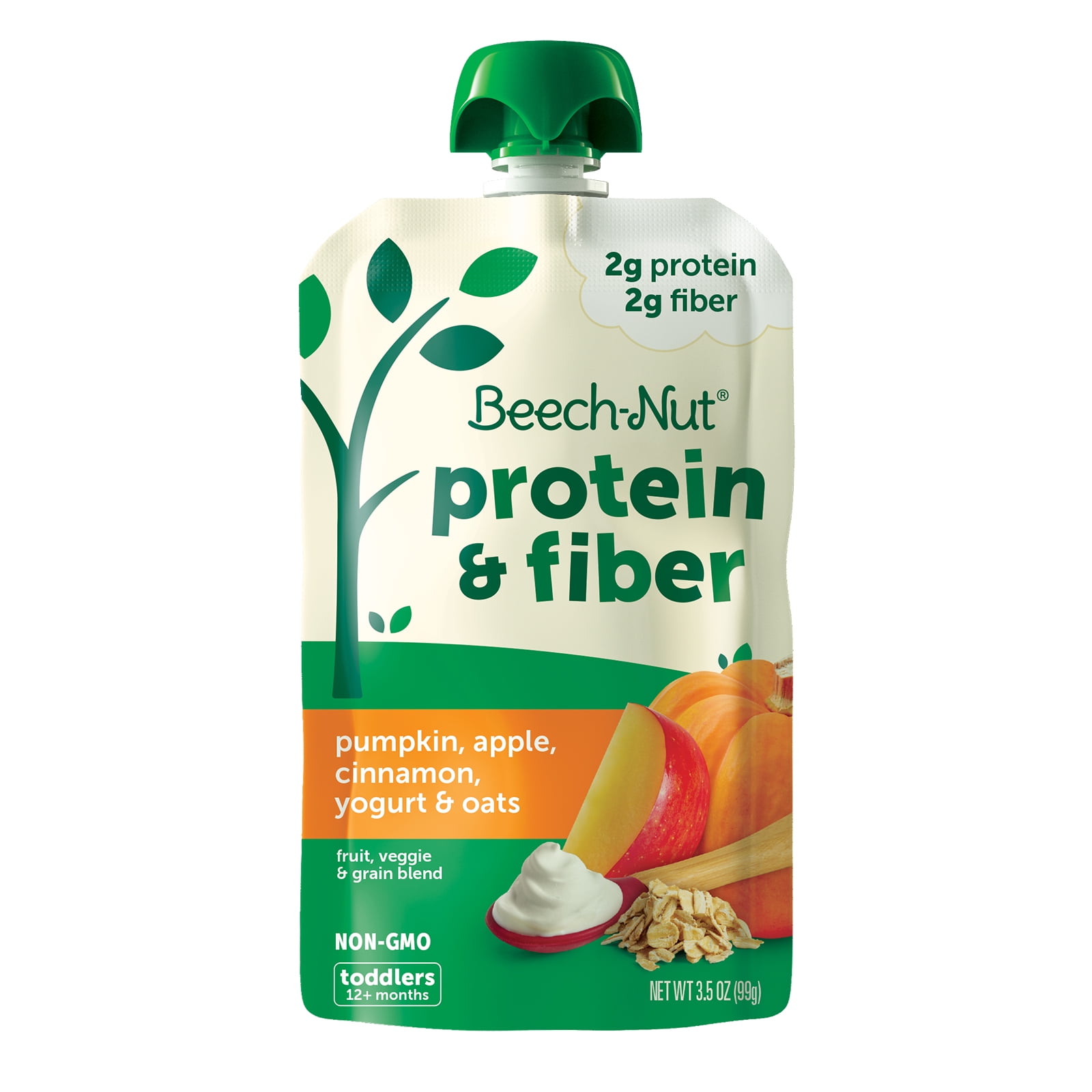 Beech-Nut Baby and Toddler Food Pouches are made with real ingredients, gently cooked and packed in convenient pouches for on-the-go feeding. Our Protein & Fiber fruit, yogurt & grain blend pouch contains a puree of pumpkin, apple, yogurt, oats & cinnamon, gently cooked with indirect heat to preserve flavor and nutrients. It also includes 2g of protein and 2g of fiber. This Stage 4 Beech-Nut pouch is ideal for your 12+ months old toddler.The benefits of Protein & Fiber for your little one: