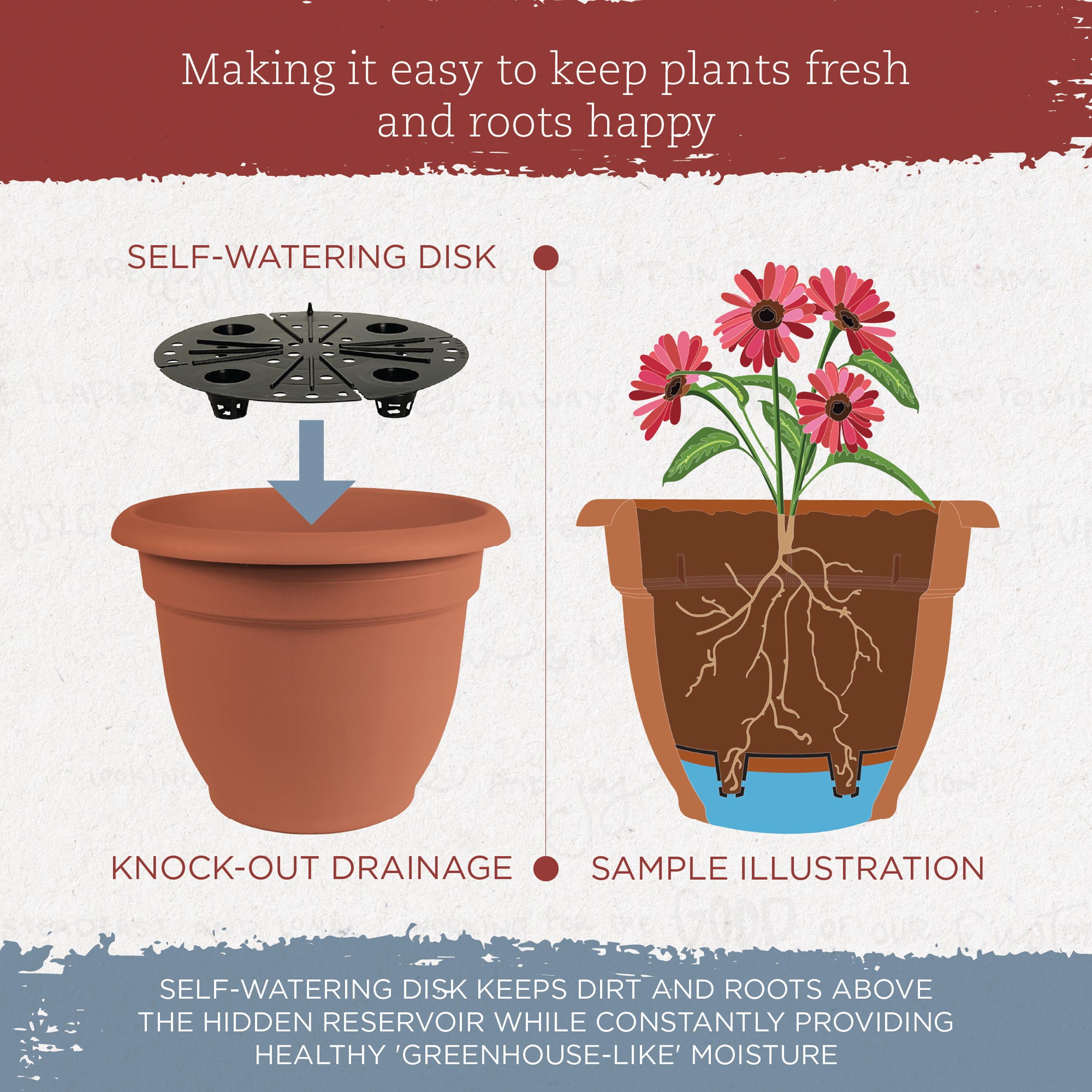 - Self-watering disk included. The disk helps to store reserved water, which can be used up by the plants at a later time. Plant will absorb water when needed.