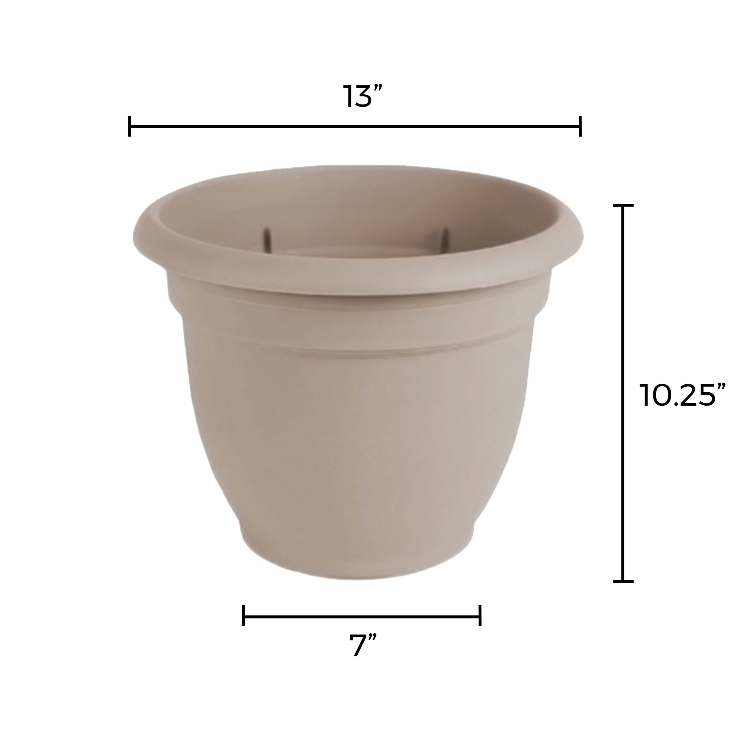 ARIANA COLLECTION by Bloem: The planter waters plants when you’re not looking and helps keep your plants from drying out. Here’s how: Inside the planter, at the bottom, is a hidden reservoir that holds approx. 1 inch to 3.5 inches of water (depending on planter size). The self-watering insert keeps dirt and roots above the hidden reservoir line while constantly providing healthy “greenhouse-like” moisture through the evaporation process. If you’re forgetful, or you’re just not home very often, self-watering containers are a must-have. They’re also helpful if you’re growing in an area that’s not convenient to a water spigot, such as a balcony. How a self-watering planter works: the potting mix is held above the water line by a sturdy screen. The water chamber is connected by small porous channels filled with soil, which then acts as a water wick. As water is used by the plant or evaporates from the surface of the soil, capillary action draws more water up from base of planter. The soil has just the right amount of water all the time, but also maintains air pockets, which the plant roots need to stay healthy. Color Beige/Khaki Shape Round Material Plastic Resin. High-Density Polyethylene (HDPE) #2 & Polypropylene (PP) #5.