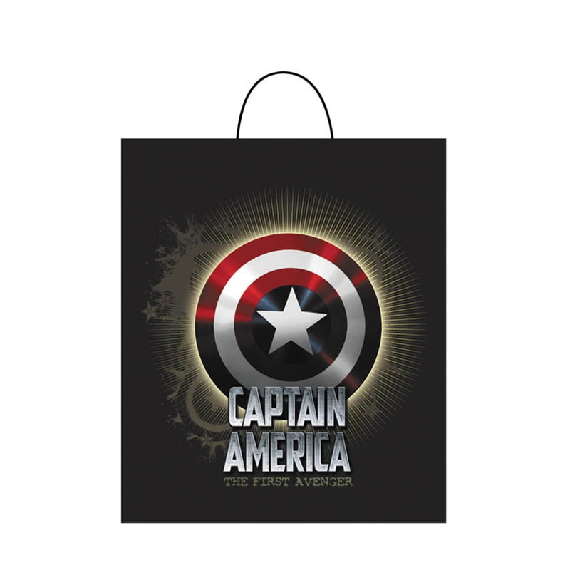 Captain America Movie Treat BagEvery half-pint hero needs a place to keep his Halloween treats, why not try this Captain America Movie Treat Bag to do the job? This plastic Captain American treat bag features Captain America’s trusted shield with the words "Captain America The First Avenger" and a solid plastic handle to haul around your trick or treating candy this Halloween.