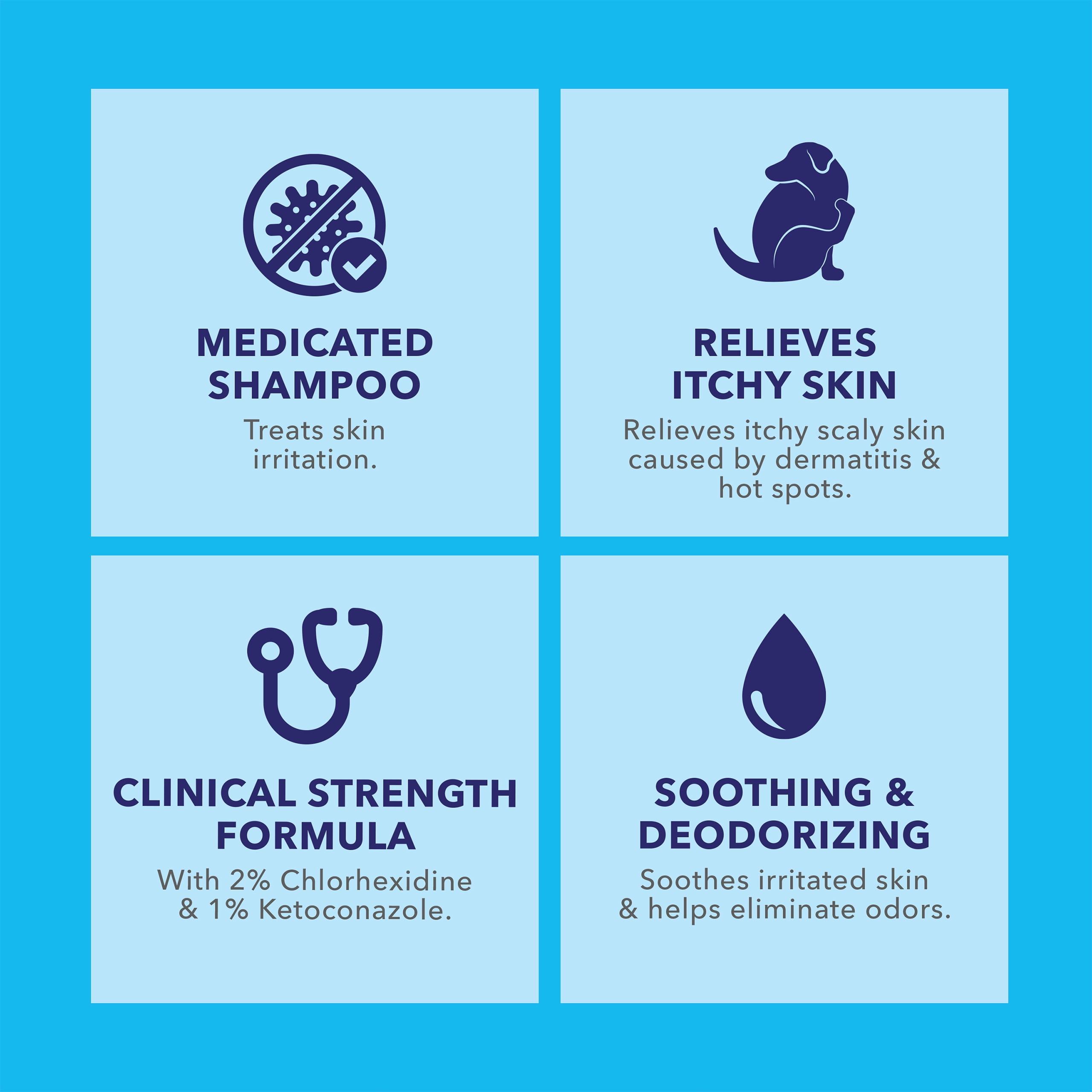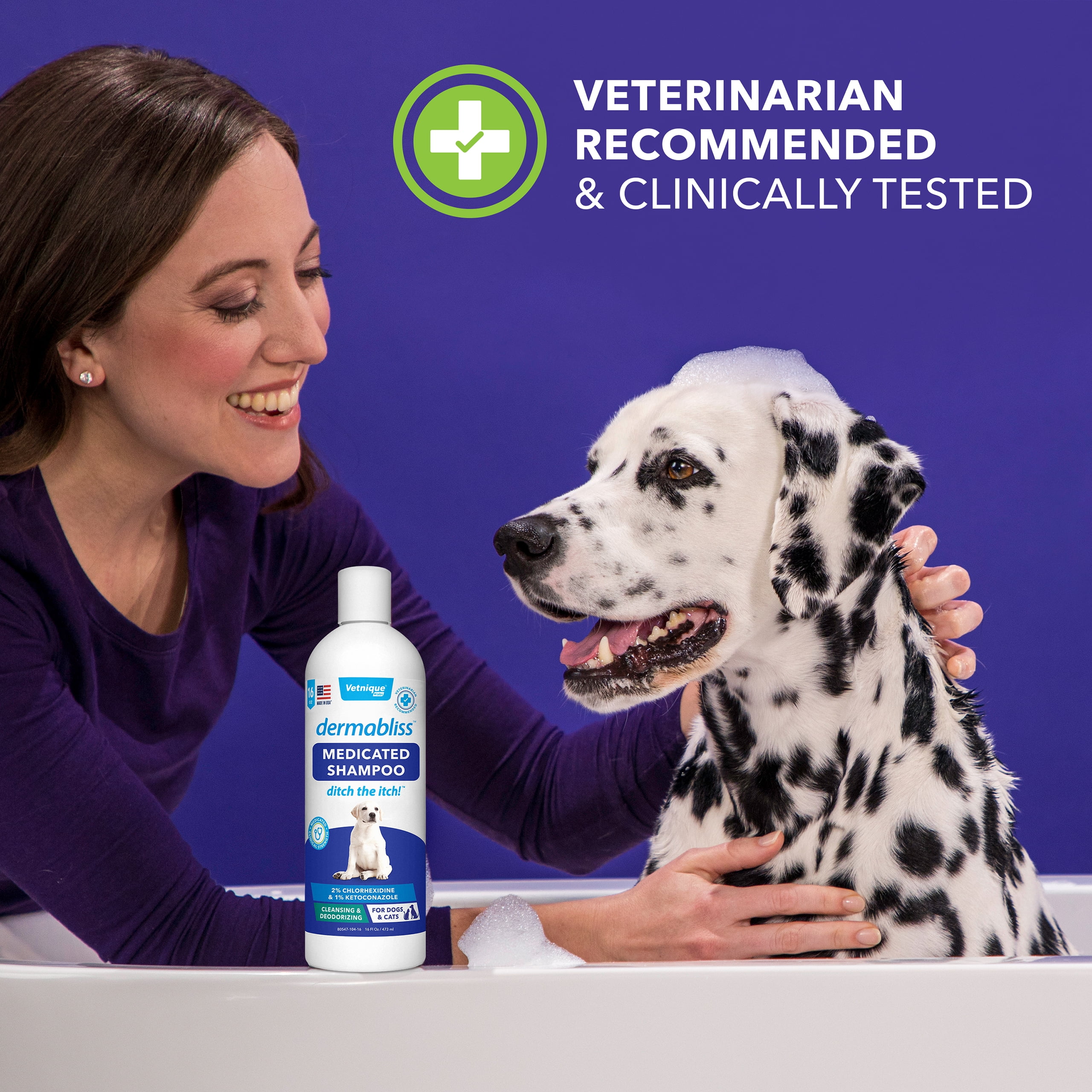 - VETERINARY STRENGTH FORMULA – Dermabliss Medicated Dog Shampoo contain 2% Chlorhexidine which decreases bacteria on skin. They also contain 1% Ketoconazole that is designed to treat skin infections like ringworm and dry, flaky skin conditions.