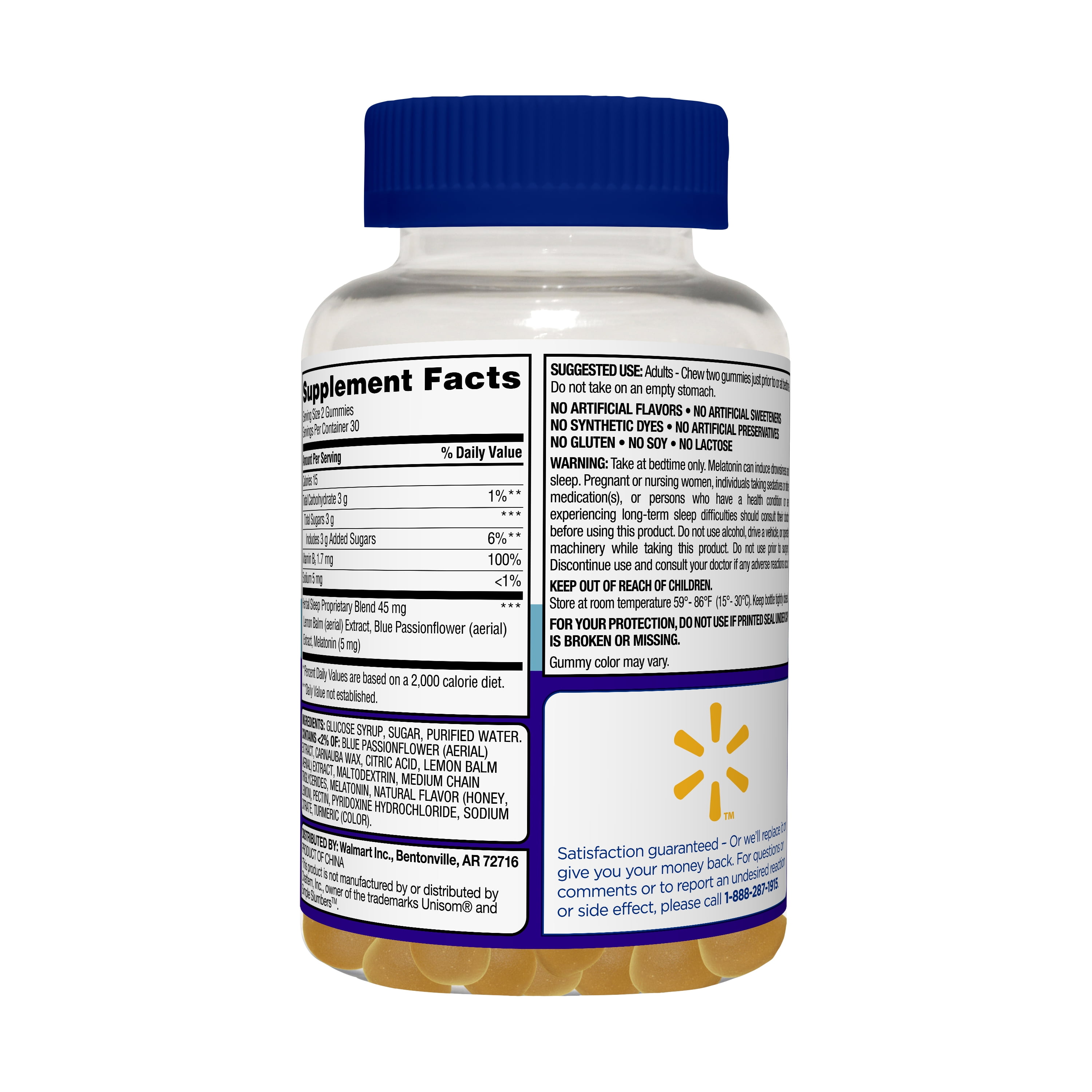 Our Equate Drug-Free Sleep Support* Gummies are a simple and great-tasting way to fall asleep faster, wake up less, and feel refreshed in the morning.* One serving size of 2 gummies delivers 5 mg of melatonin to promote healthy sleep, passionflower and lemon balm to help soothe and calm the mind, and vitamin B6 to help support brain health.* These gummies feature a delicious honey-lemon flavor. They are also drug-free and non-habit forming. You can rest assured that Equate Drug-Free Sleep Support* Gummies Dietary Supplement, Honey-Lemon Flavor is produced with strict quality guidelines and is backed by our quality guarantee. Simply take two gummies just prior to or at bedtime to help promote healthy and restful sleep.*