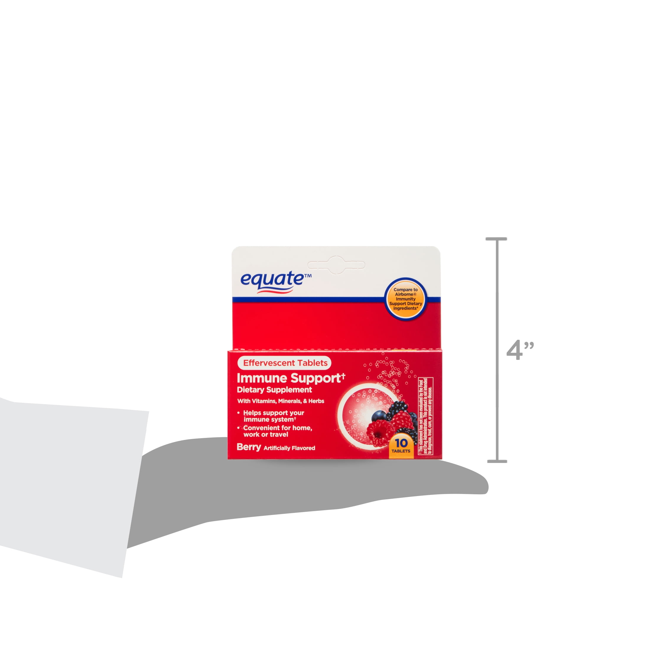 Give your health a boost with the Equate Immune Support Dietary Supplement. It has a refreshing berry flavor and dissolves easily in water. These 10 effervescent tablets come in a small tube which makes it easy to take at home, work, or while traveling. Fortified with 13 essential and beneficial vitamins, minerals and herbs, these tablets help support your immune system, especially if you are feeling sick or during flu season. Take care of your immune system with these berry flavored Equate Immune Support Dietary Supplement.