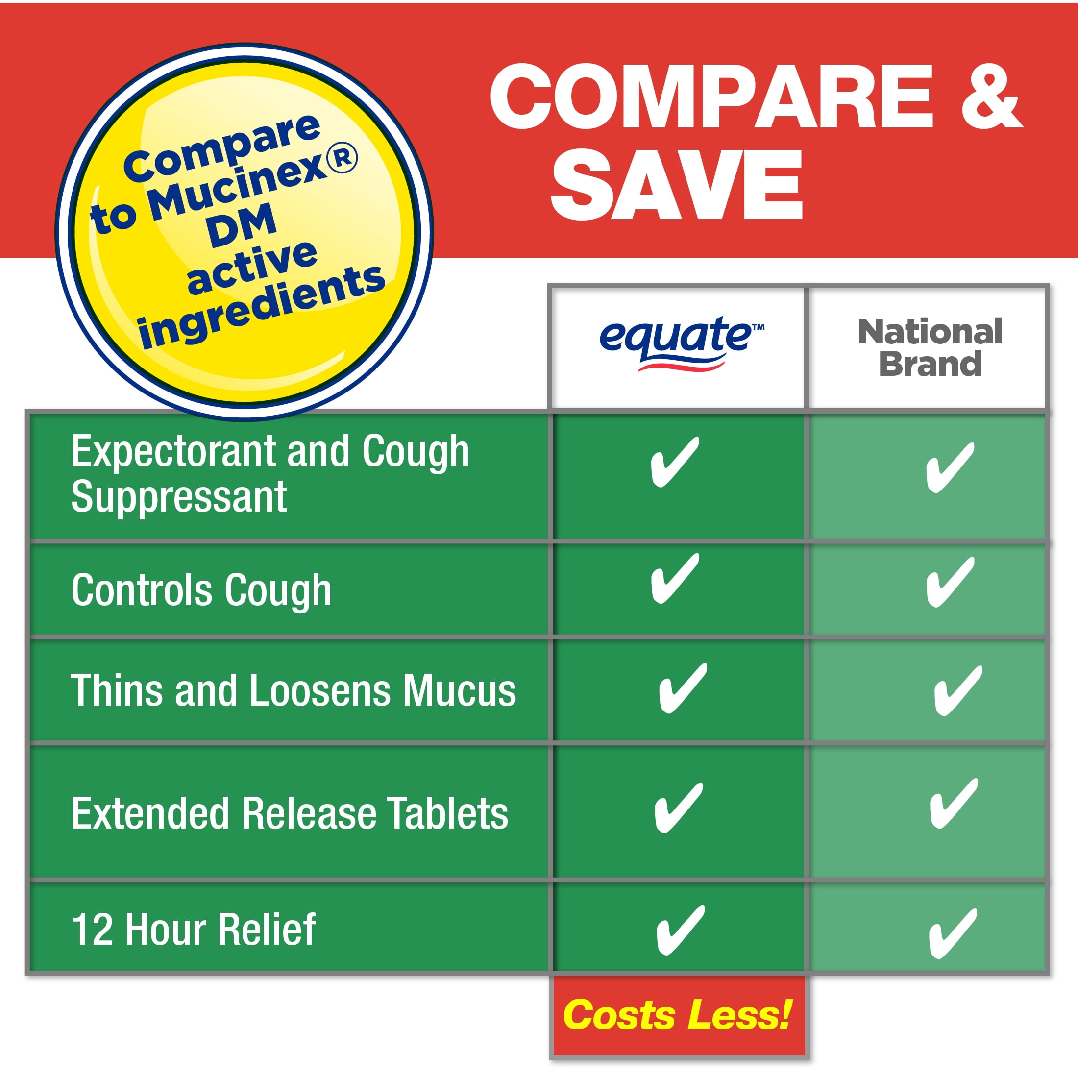 Compare to the active ingredients in Mucinex DM. Equate Mucus DM Guaifenesin and Dextromethorphan Hydrobromide Extended-Release Tablets, 600 mg/30 mg, 20 count is a cough suppressant and expectorant that helps loosen phlegm (mucus) and make coughs more productive. Reduces chest congestion caused by the common cold or inhaled irritants. Controls wet and dry coughs due to minor throat or bronchial irritation. Thins and loosens mucus for 12 hours and temporarily relieves the intensity of coughing. This product does not contain gluten. For adults and children 12 years and older. Breathe easier with 12 hour cold medicine. Reduces the impulse to cough to help you get to sleep.