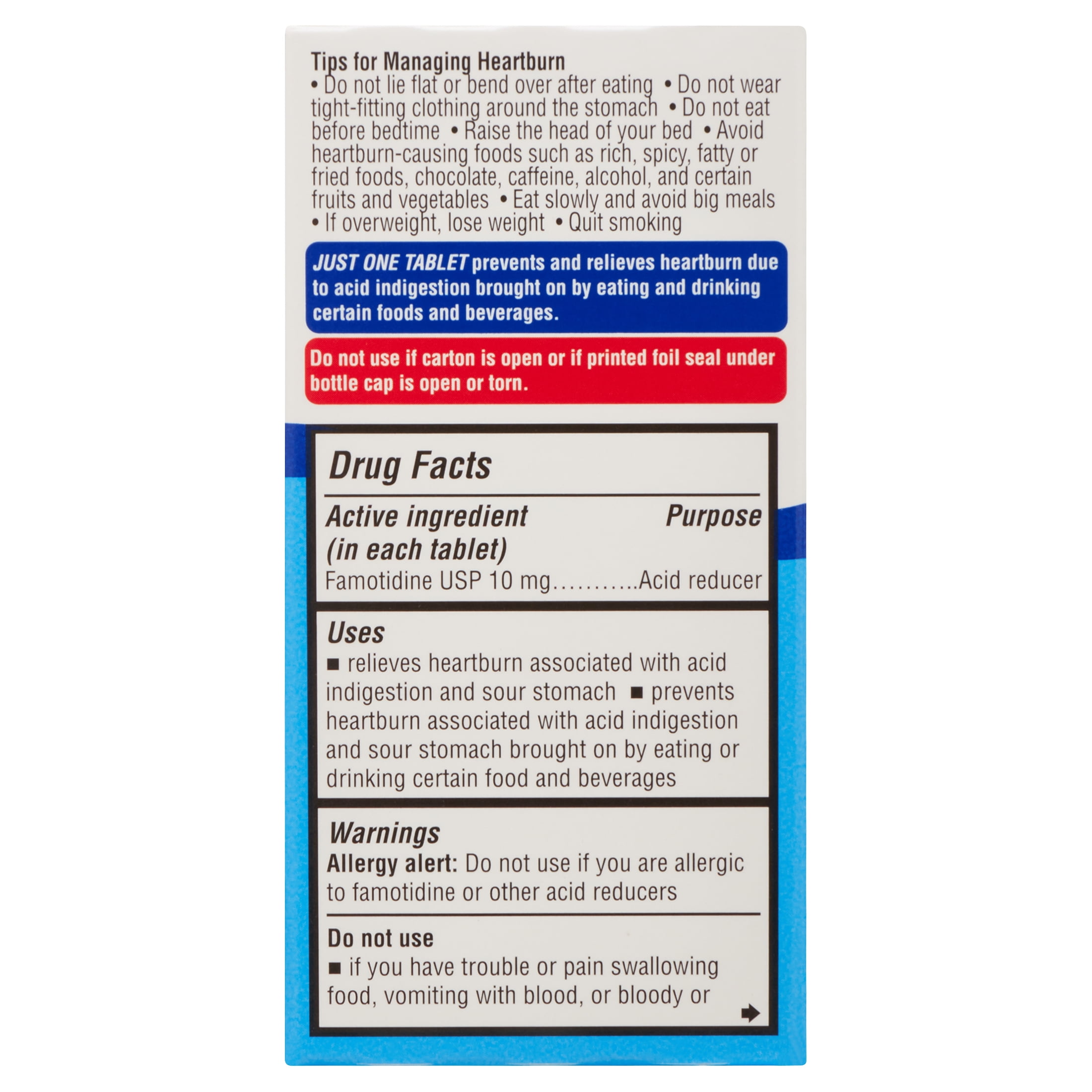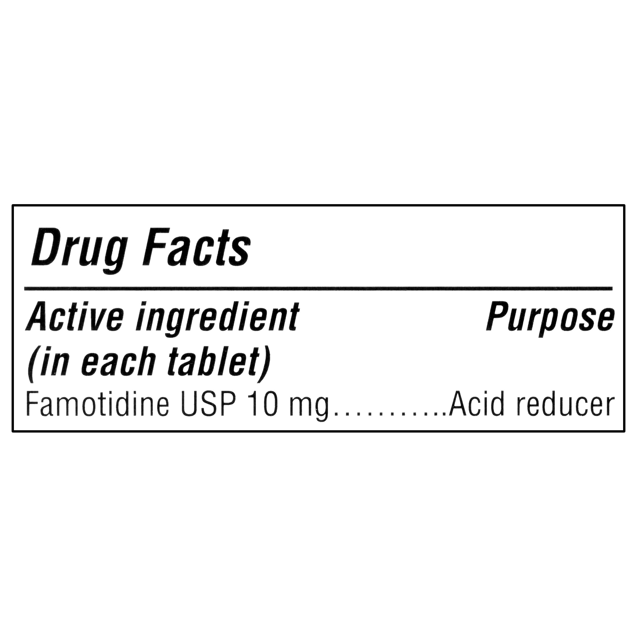 - Active ingredient (in each tablet): Famotidine USP 10 mg (acid reducer)