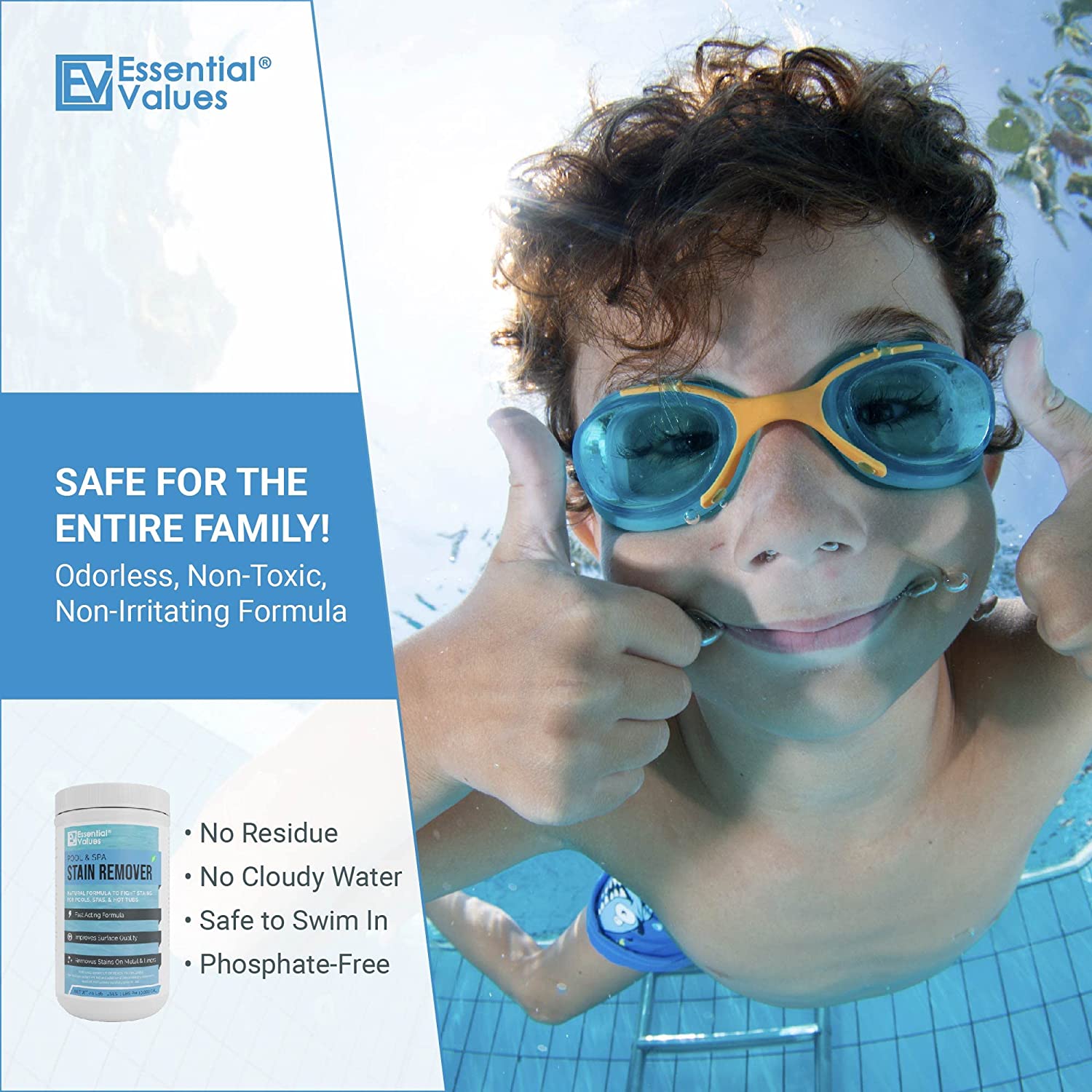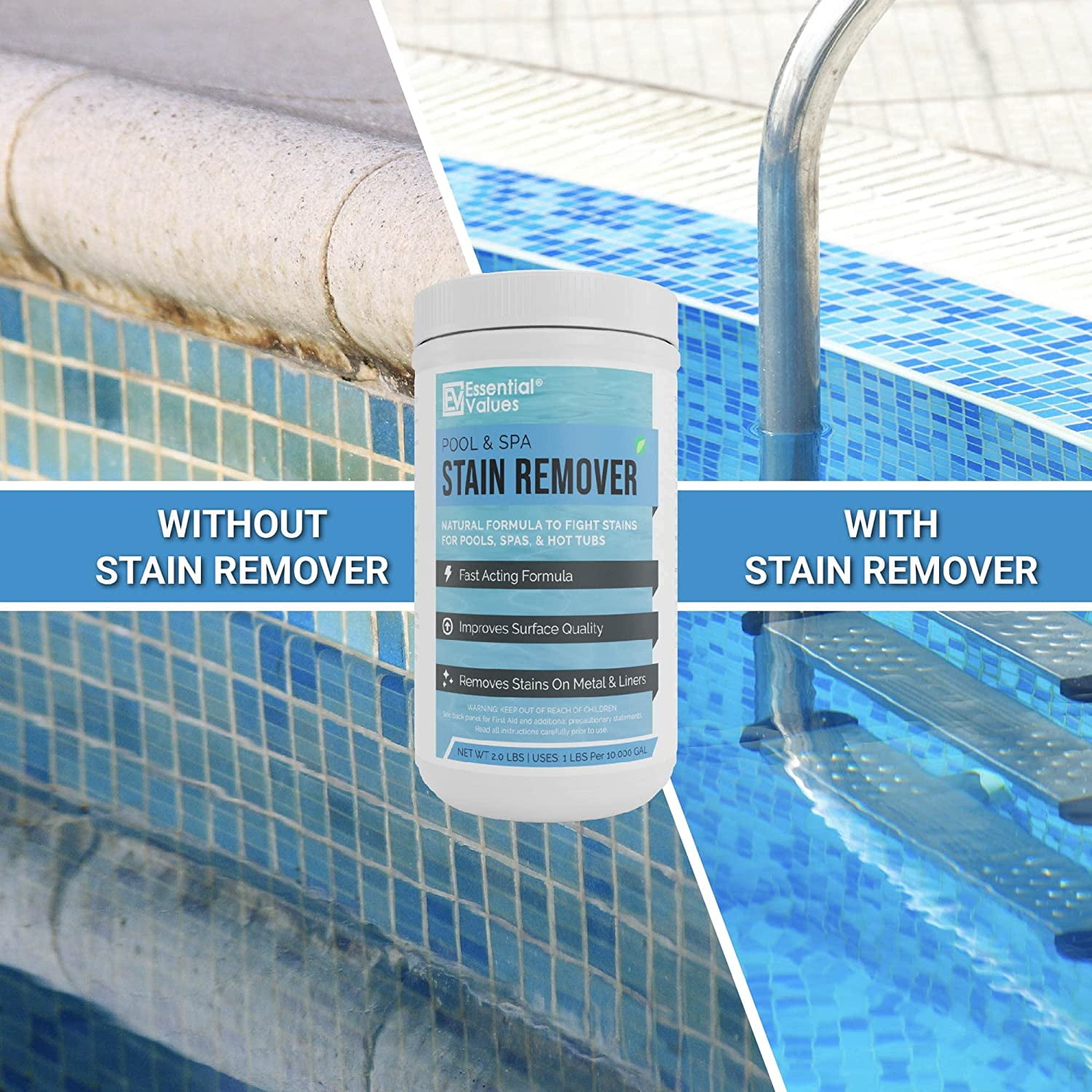 From Water Discoloration To Surface Stains, Essential Values Pool & Spa Stain Remover Has Been Engineered To Be Cost Effective, Simple To Use, & Powerful While Maintaining Natural Ingredients. No Harsh Chemicals Are In Our Product! Though Our Formula Does Not Alter Chemical Balances, It Is Our Recommendation For Best Results To Balance Your Pool Or Spa Before & After Use. PH Levels Too Low or Too High Will Not Allow Penetration From Our State Of The Art Technology. Please Check With Your Pool Manufacture’s Guide For Adequate Stain Removal. Natural & Safe, Works Best for Vinyl Liners, Fiberglass, Metals – Removes Rust & Other Tough Stains Without The Use of Harsh Chemicals