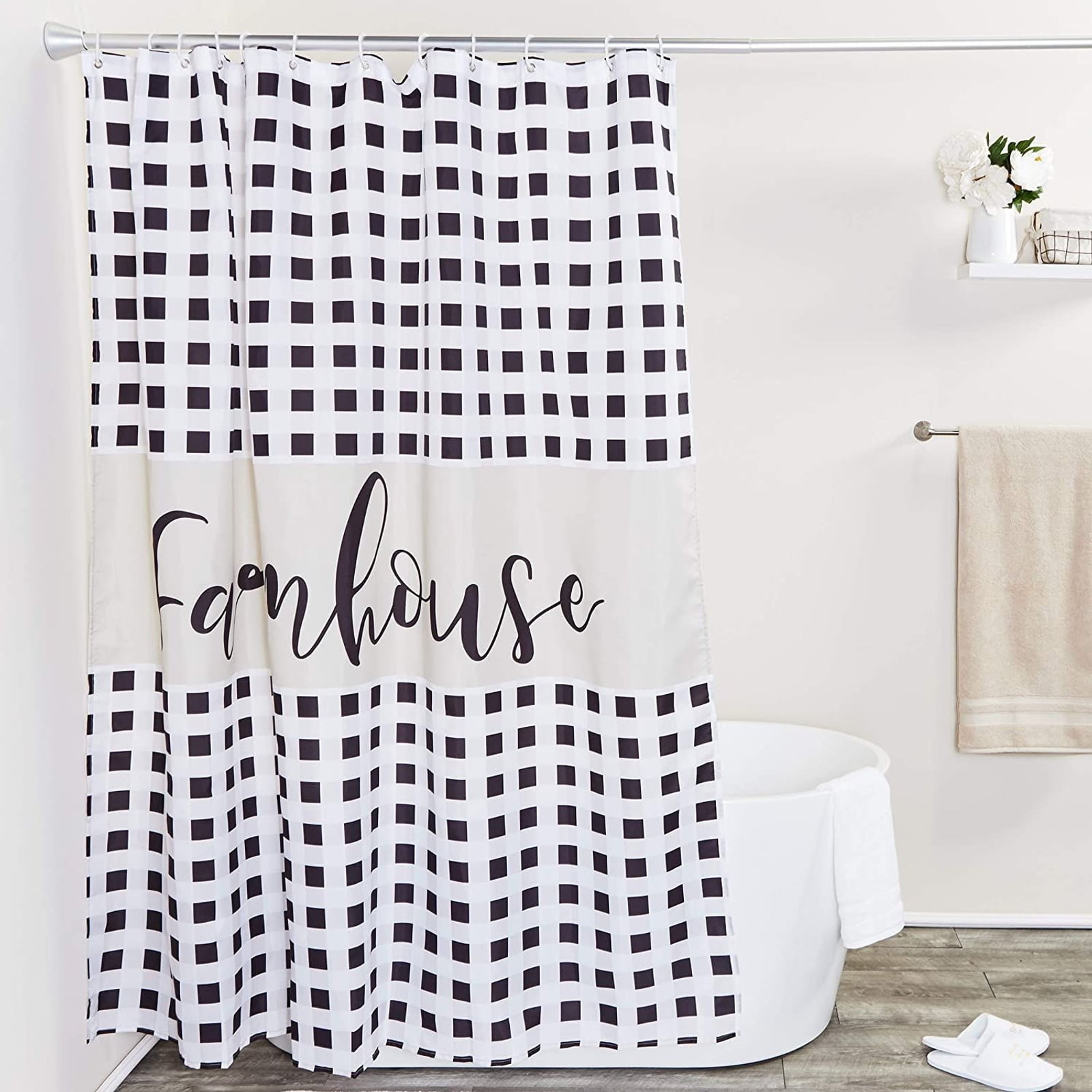 - Versatile Design: This buffalo check shower curtain features black and white checkers, with Farmhouse text in the center; an ideal choice for bathtubs and showers at home, campers, hotels, motels, and dorm rooms