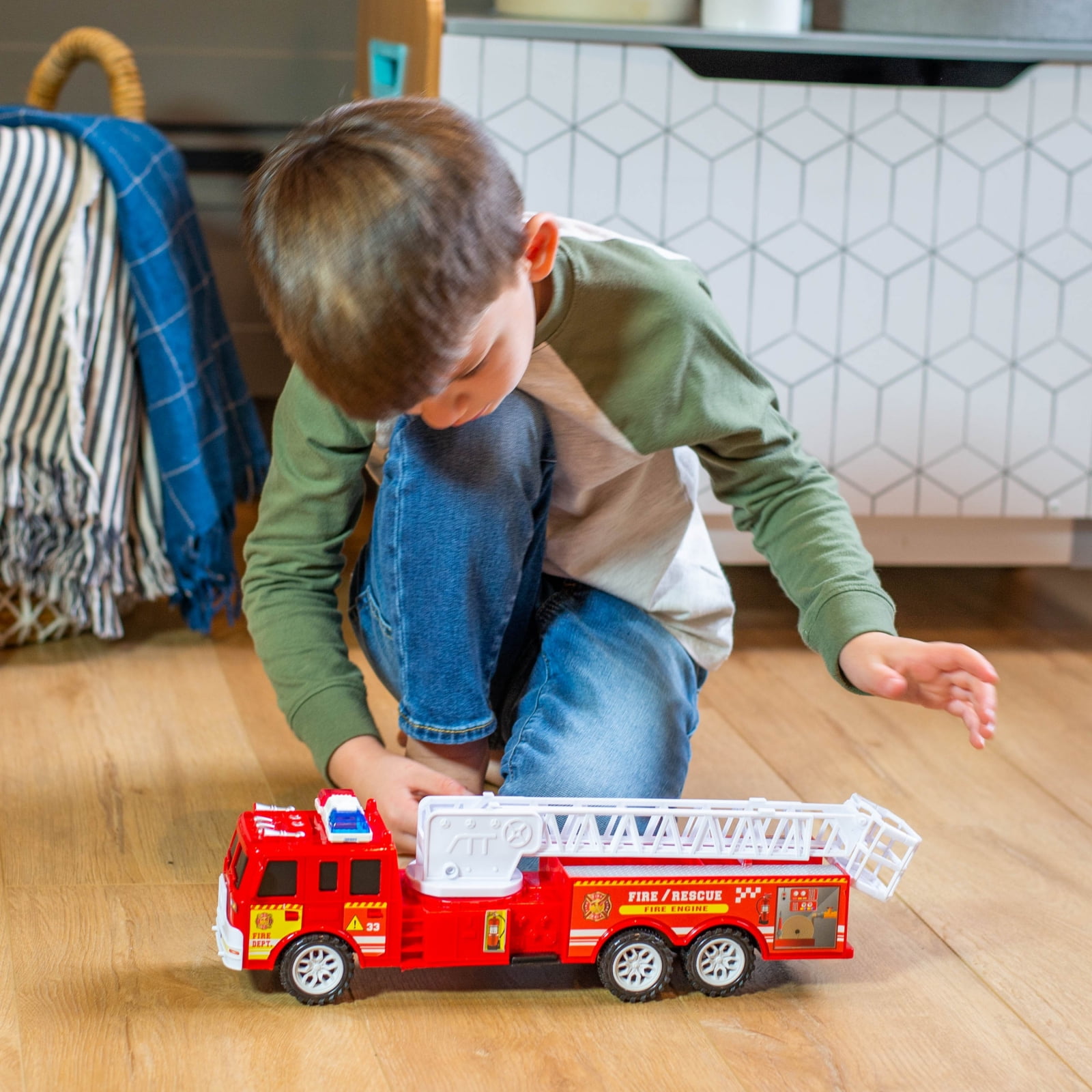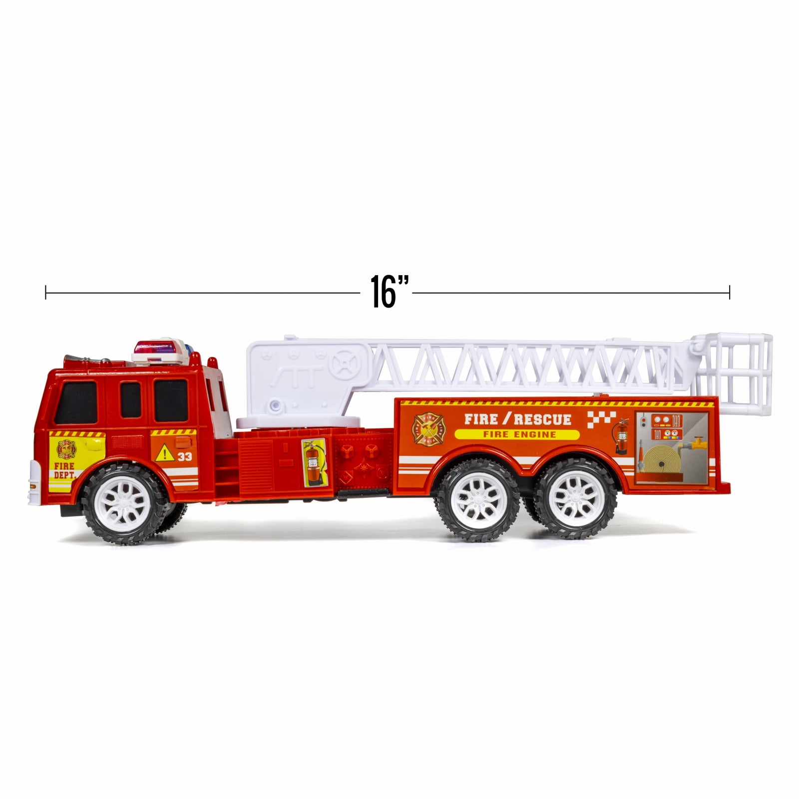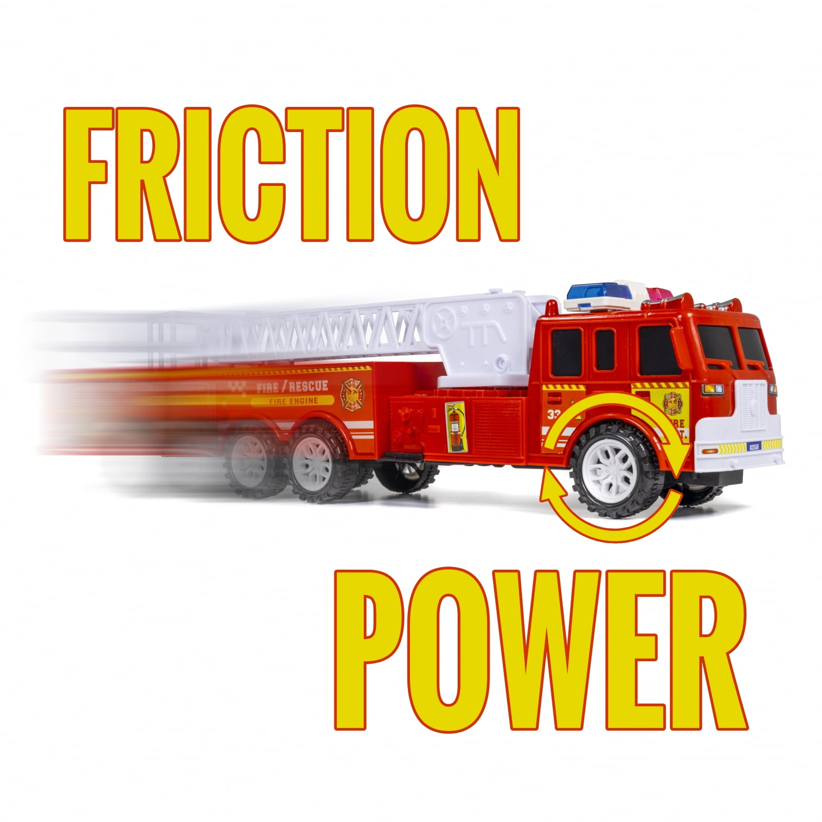 - FRICTION-POWERED FUN: With fast-moving wheels, the friction-powered maneuverability of the toy truck allows for easy gliding along the floor, working optimally on hard and flat surfaces; easy to pull back and create resistance, kids will have a blast watching and chasing the fire truck rescue toy as it races across the room; batteries ARE included with toy truck