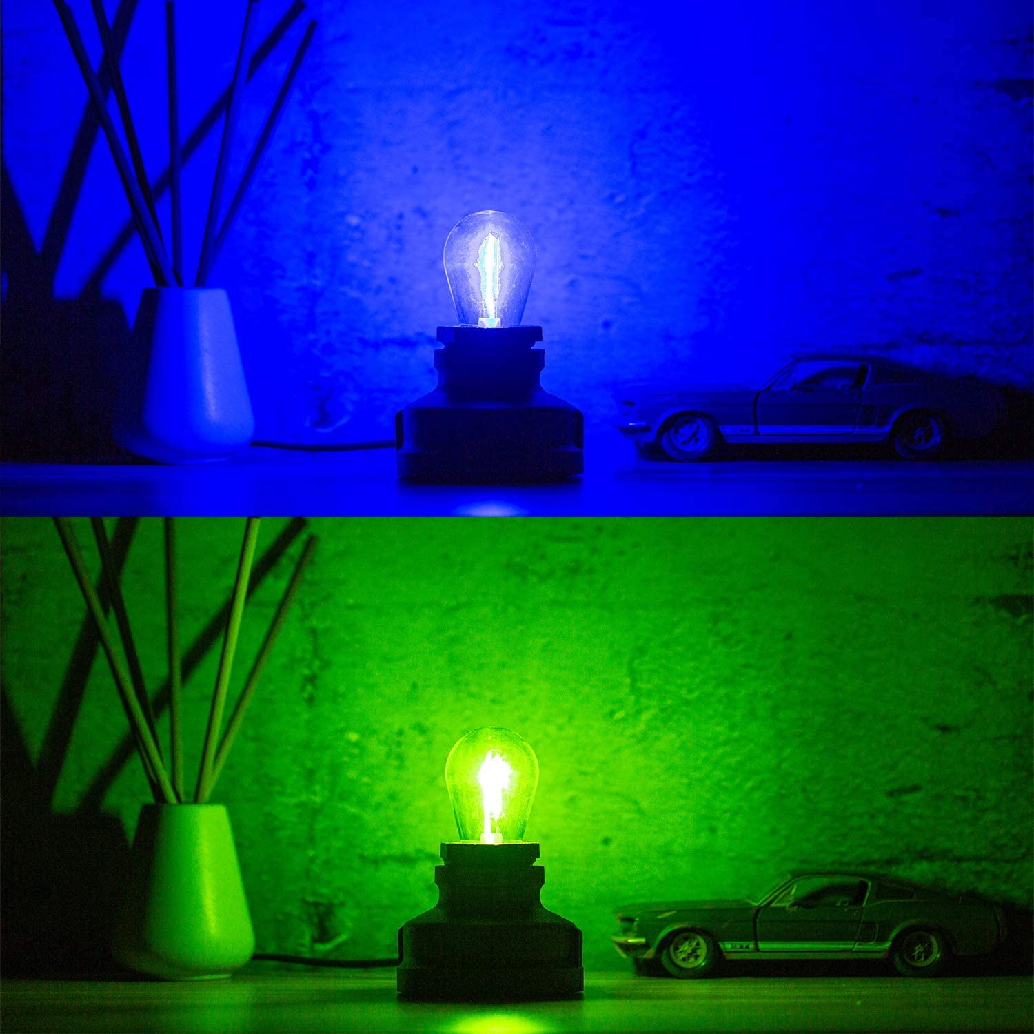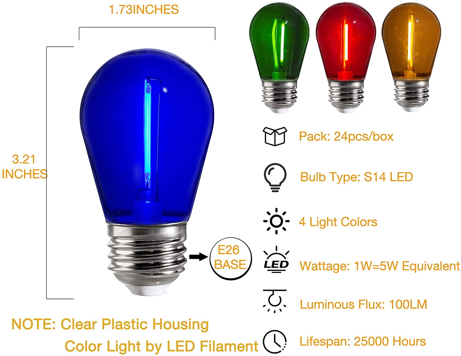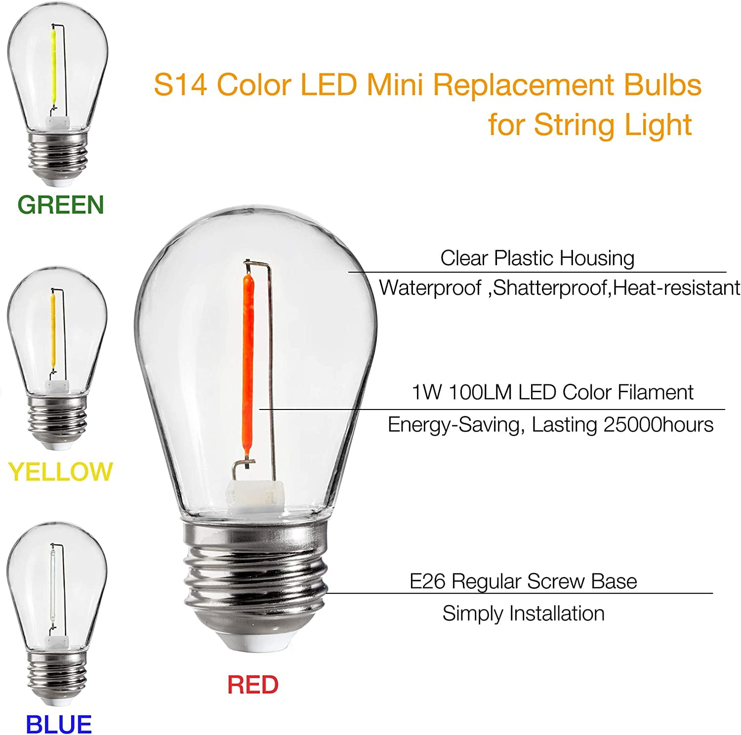- Multicolored: Clear plastic S14 LED string light bulb with colored filaments: reddish orange filament(red light),clear filament(blue light),lemon filament(green light),orange filament(warm light),glowing off as same as glass light bulbs