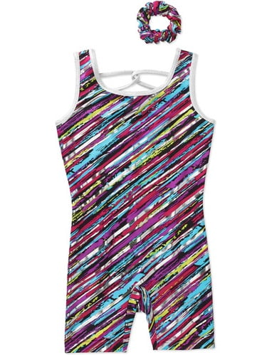 Danskin Now Biketard with Back Straps now comes in an energetic print and silver foiled latice back detail biketard and matching hair tie. Made of our durable 94% Polyester, 6% Spandex that is easy to wash and wearGirls’ Biketard with Back Straps