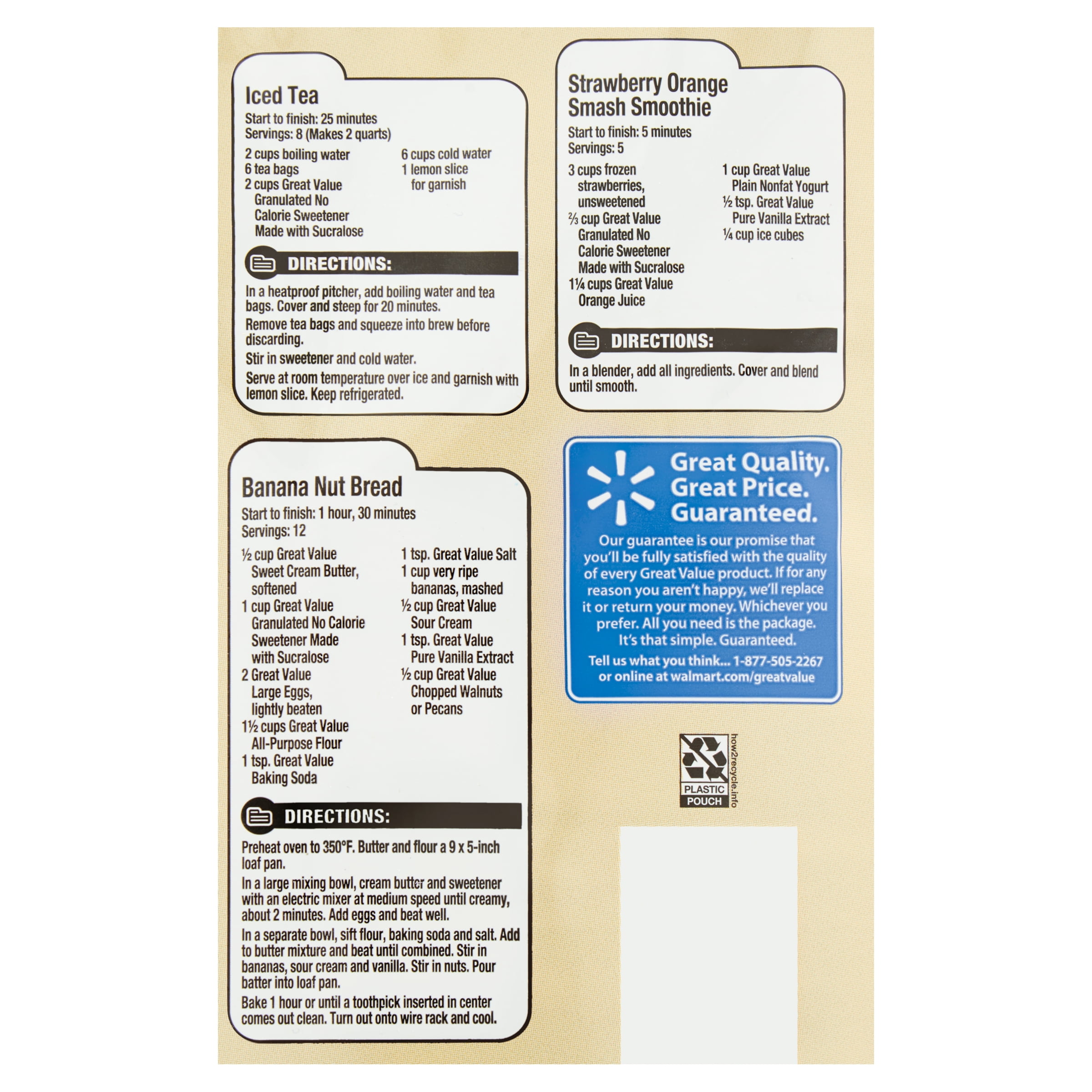 Savor your sweet moments with Great Value Granulated No Calorie Sweetener Value Pack. Sucralose is one of the most popular artificial sweeteners and has been used to substitute sugar for many years. It has a sweet flavor, similar to sugar, without any of the calories. Your steaming hot coffee or iced tea can be as sweet as you like guilt-free without any added calories or the dangerous chemicals included in other artificial sweeteners. Great Value Granulated No Calorie Sweetener features a sucralose to sugar conversion chart, so you can substitute sugar in all of your cooking or baking recipes. You can also try this no-calorie sweetener on fruit or cereal for an extra sweet treat. When you use Great Value Granulated No Calorie Sweetener Value Pack your sweet tooth and your waistline will thank you.