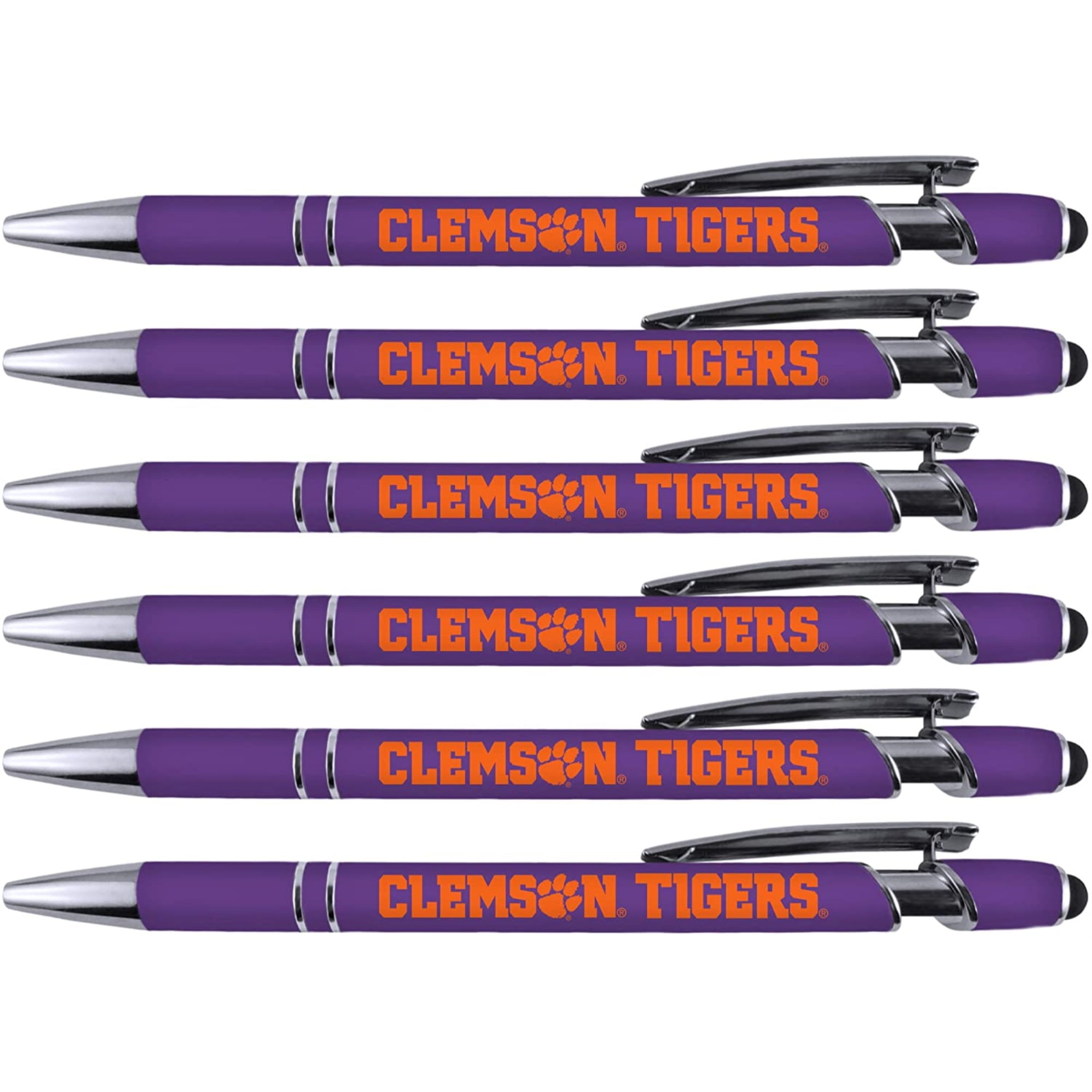 Clemson Comfort Feel Metal Pens – 6 Pack: Each pen is a pen with a soft barrel that provides comfortable writing, featuring school artwork. They also have a stylus on the end so that they can be used on touch screen devices. NCAA licensed. Pens are 1mm ballpoint, retractable pen with black ink.