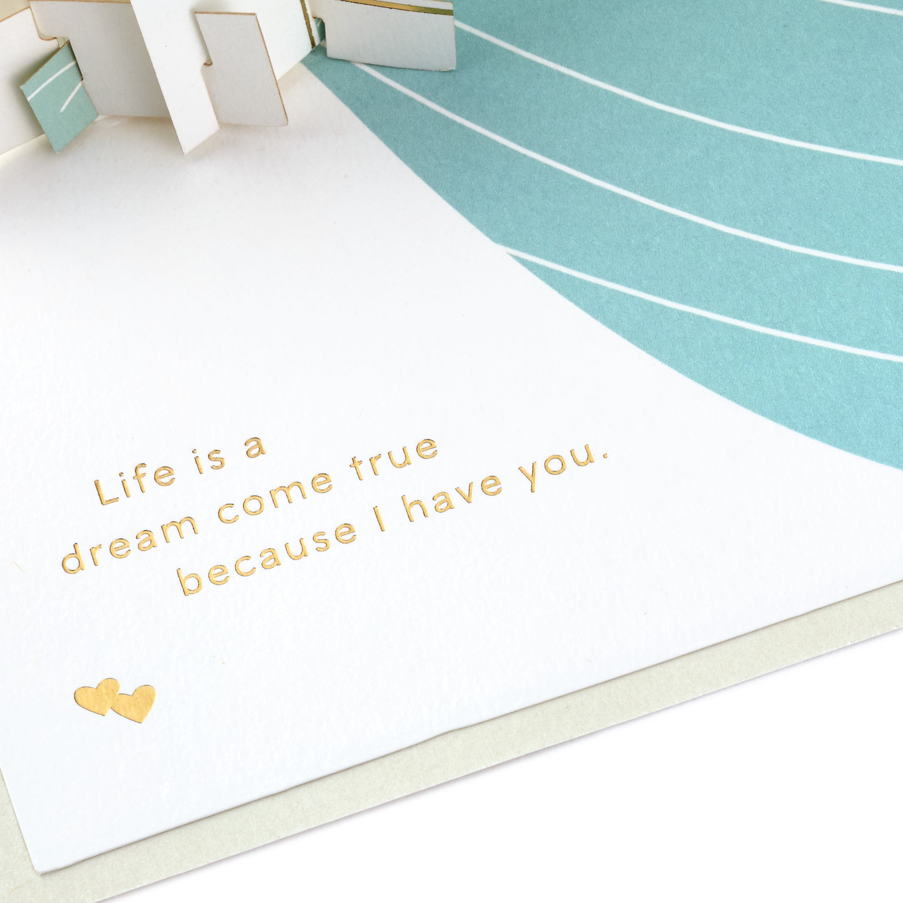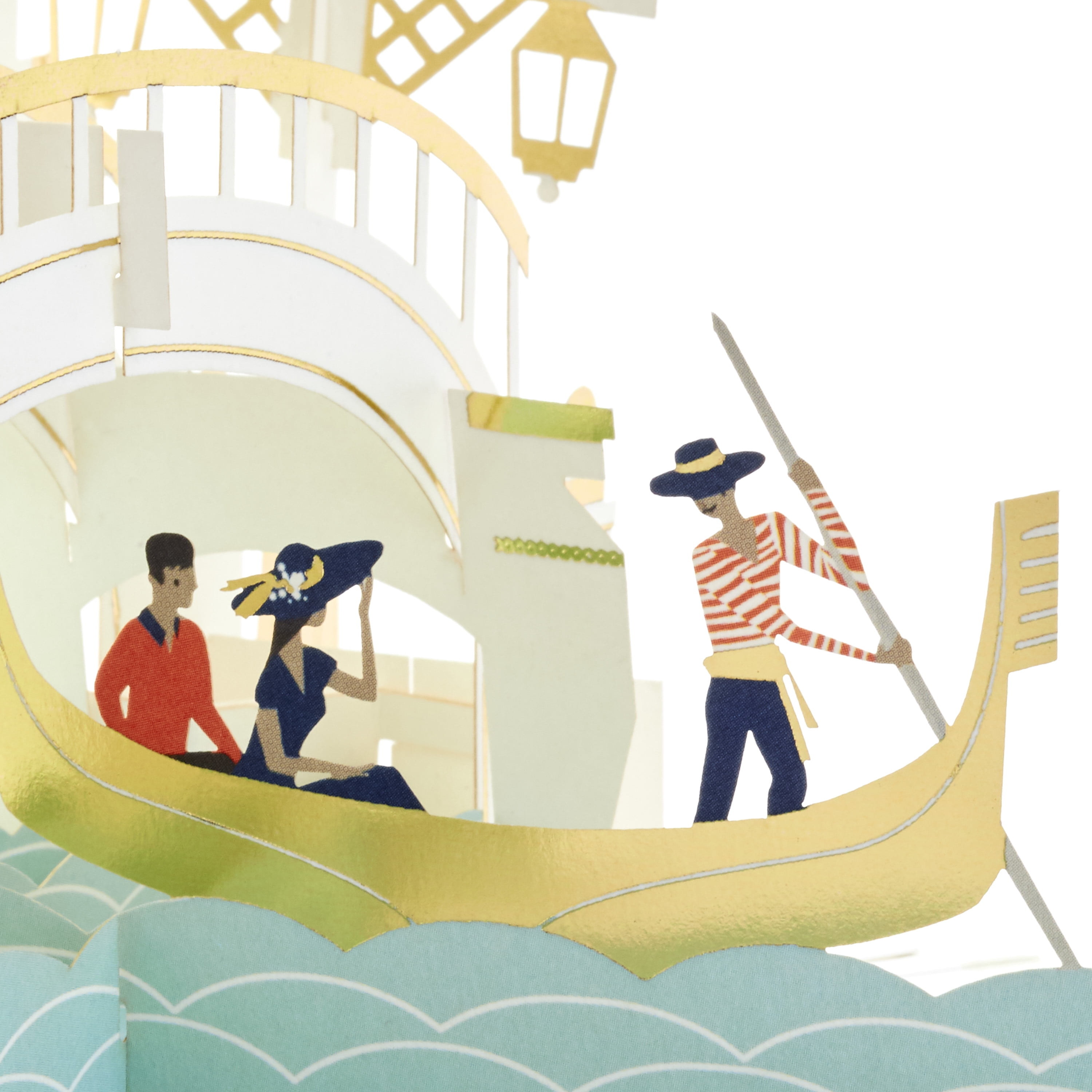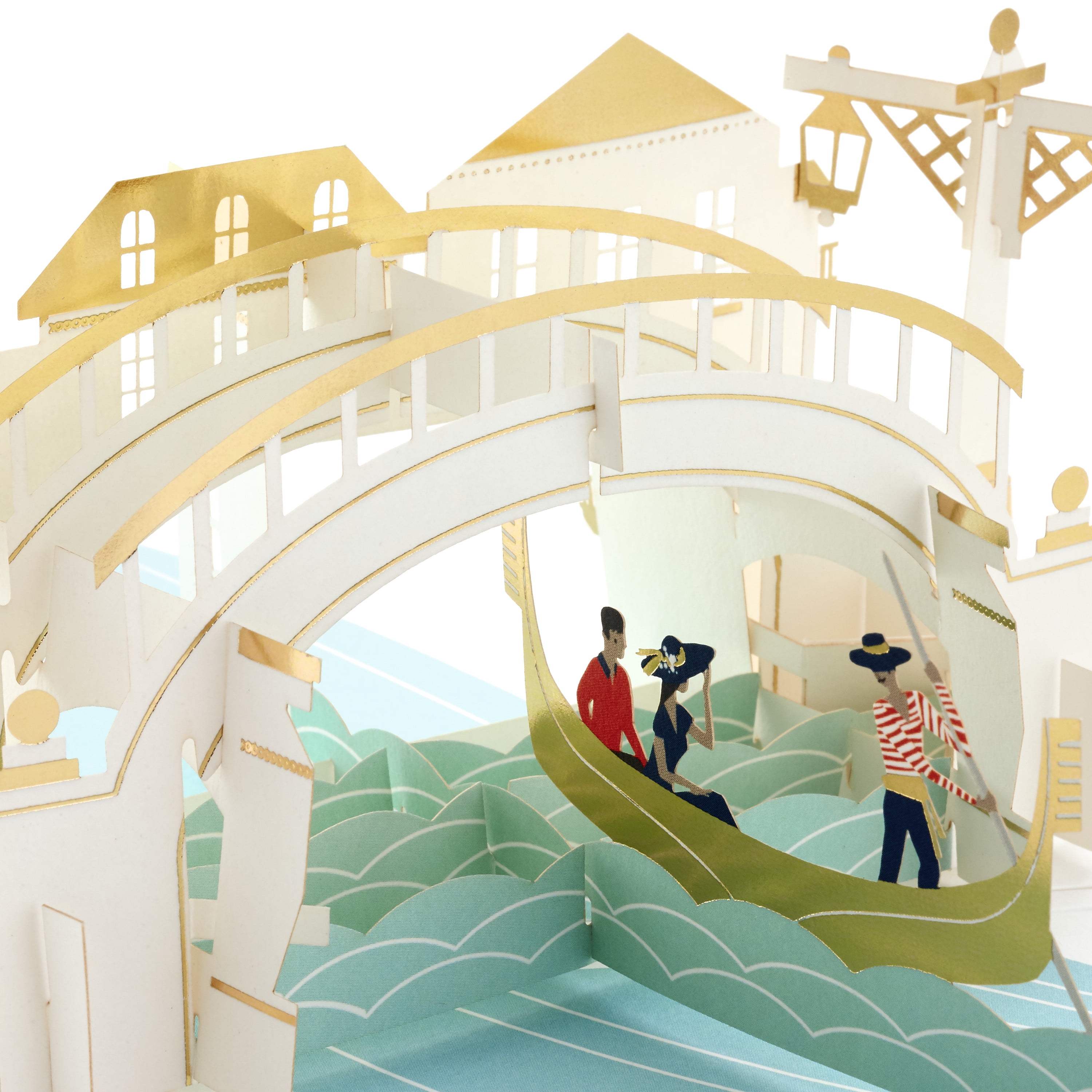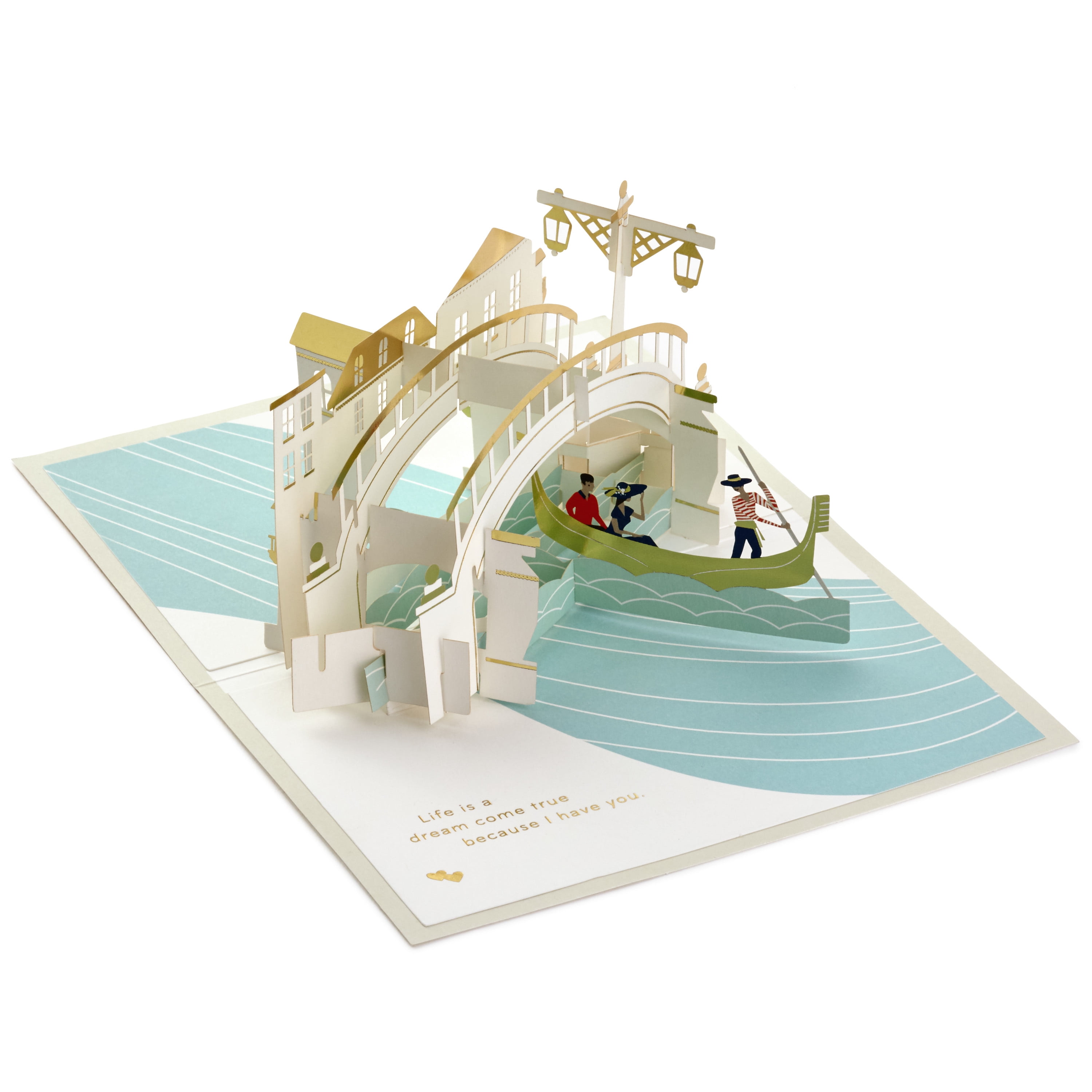- Striped cover features a gold foil border and "I love you" lettering. Inside features an elaborate surprise pop-up of a couple passing under a bridge on a romantic gondola ride and the message: "Life is a dream come true because I have you".