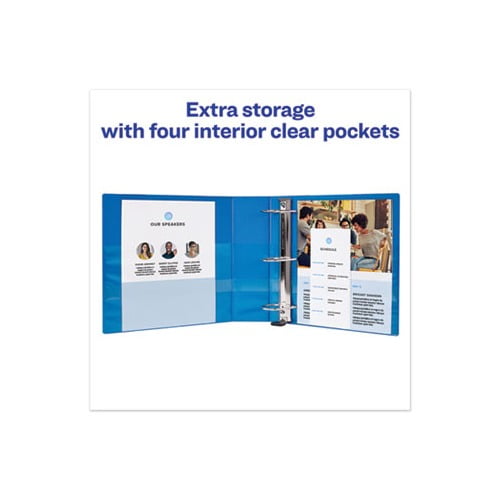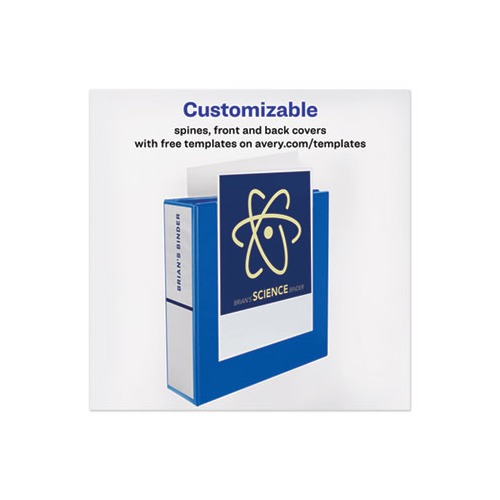 Heavy-Duty view binder with one touch EZD rings is perfect for long-term, regular use. Tear-resistant DuraHinge design is stronger and lasts longer. DuraEdge feature makes the sides and top more pliable, providing greater split resistance. Deep-textured film offers a smoother finish and features a linen pattern for a high-quality look and feel. Clear cover and spine for easy customization. Four clear, interior pockets provide extra storage space. Wider front and back panels fully cover standard dividers and sheet protectors. One touch EZD rings provide easy access and have a higher page capacity when compared to the same size round rings. Customize the cover with free, easy-to-use templates and designs at Avery Design & Print online. Locking RingsKeep pages secure. Binder Type: Ring Binder Style: View Binder Size Capacity: 4" Binder Sheet Capacity: 780. Green : Contains a minimum of 38% post-consumer recycled content, 38% total recycled content.