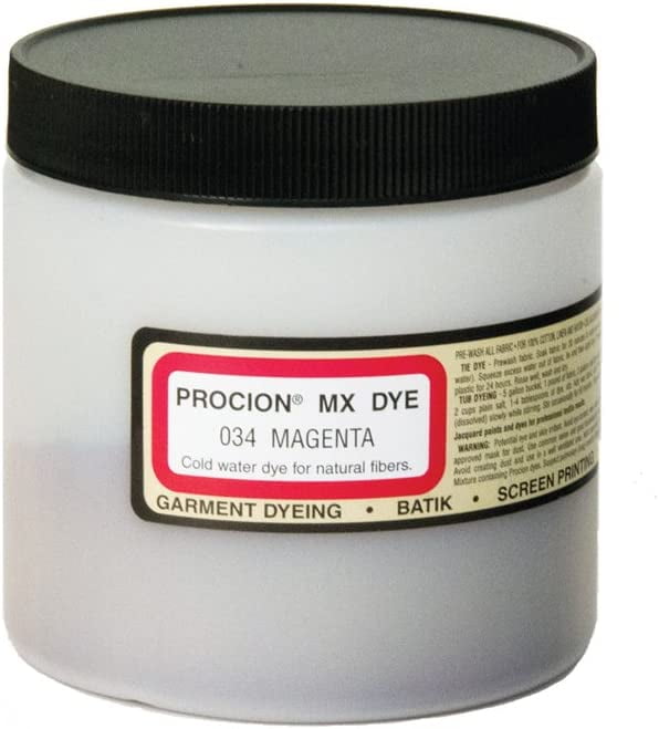 This 8oz jar of Magenta Procion MX cold water dye by Jacquard is a concentrated dye that is permanent, colorfast and washable. Create a palette of brilliant colors on all natural fabrics including cotton, rayon, linen, silk , wool, paper, reeds and wood. One of the most versatile dyes on the market Procion MX can be used to tie dye, batik, airbrush, hand paint, print and more. A 1oz bottle can dye more than 5 yards of fabric or about 9 shirts. Instructions on jar. Made in the USA.