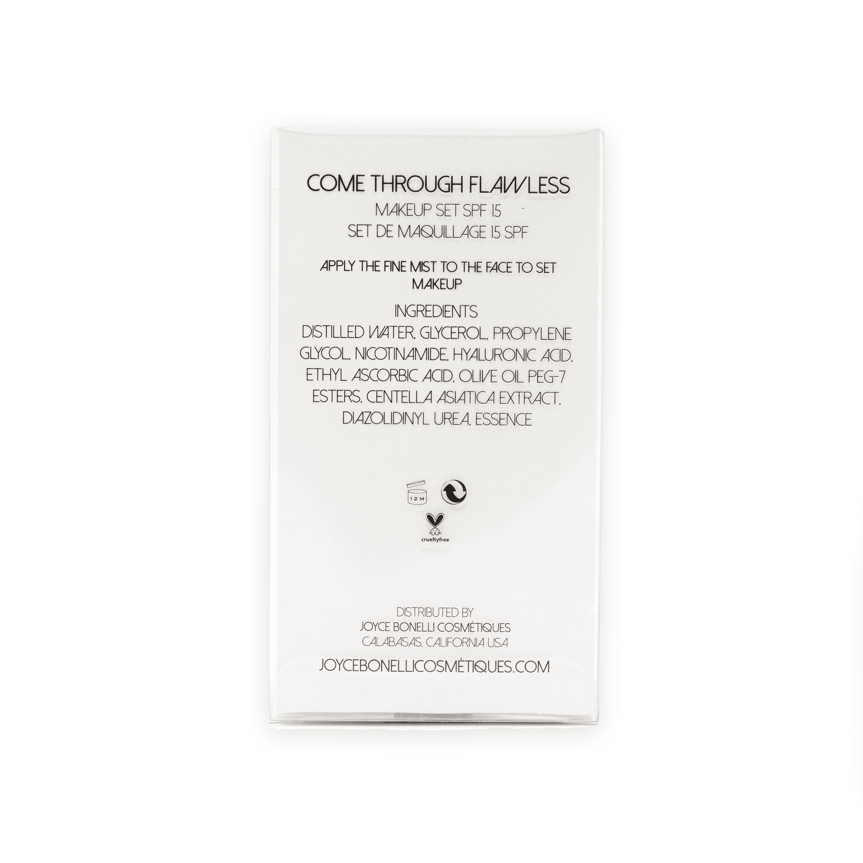 Joyce Bonelli Cosmetiques Makeup Setting Spray with SPF 15, COME THRU FLAWLESS:READY, SET, FLAWLESS! KEEP YOUR MAKEUP LOOKING FRESH AND YOUR SKIN SAFE FROM THE SUN WITH OUR ULTRA HYDRATING SPF SETTING SPRAY. This lightweight, hydrating spf setting spray protects skin from uv damage. For best results, use daily, before and after makeup application.