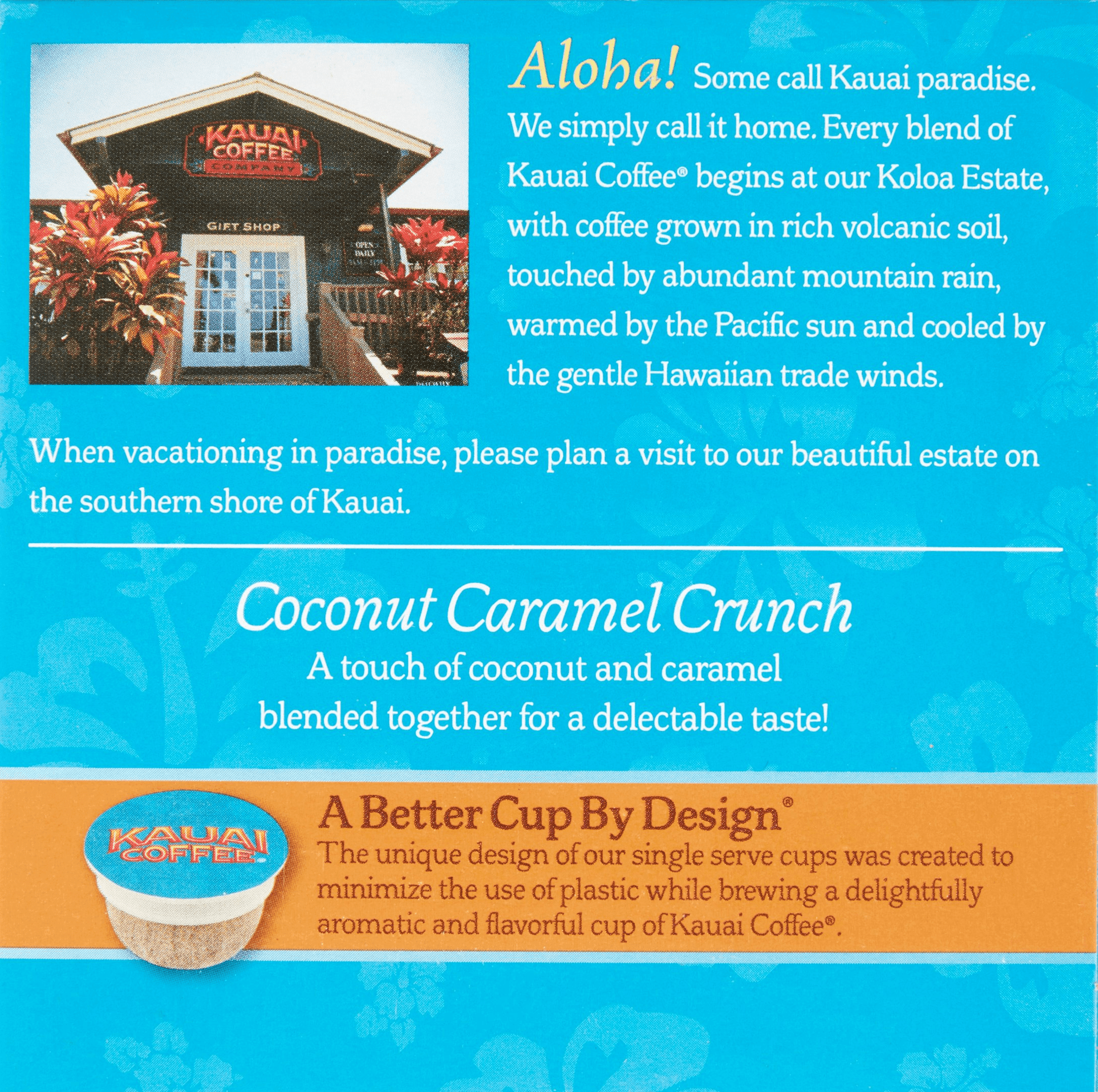 One sip of our Kauai single-serve mild roast coffee and you’re instantly transported to paradise! Island Sunrise Mild Roast coffee is a 100% premium Arabica coffee, featuring a smooth, delicious flavor and amazing aroma. The mild roast style is a 100% Arabica cup of coffee that is perfect for breakfast and will wake you up as pleasantly as an Island Sunrise. Compatible with all K-CUP brewers, including Keurig 2.0, our Filter Cup single-serve coffee pod is a convenient way to enjoy a delicious cup of mild roast coffee any time of day. Our easy-to-use, single-serve coffee pods use less plastic, making them the ENVIRONMENT FRIENDLY, smarter choice for the environment. From growing the coffee to roasting and packaging, we employ sustainable, environmentally sound practices throughout every step of the process. Kauai Coffee Company is Hawaii’s largest coffee grower, and the largest coffee grower in the U.S. We have just about 4 million coffee trees grown on 3,100 acres – a true Hawaiian coffee estate! K-CUP is a registered trademark of Keurig Green Mountain, Inc. Kauai Coffee Filter Cups are not affiliated with Keurig Green Mountain, Inc.