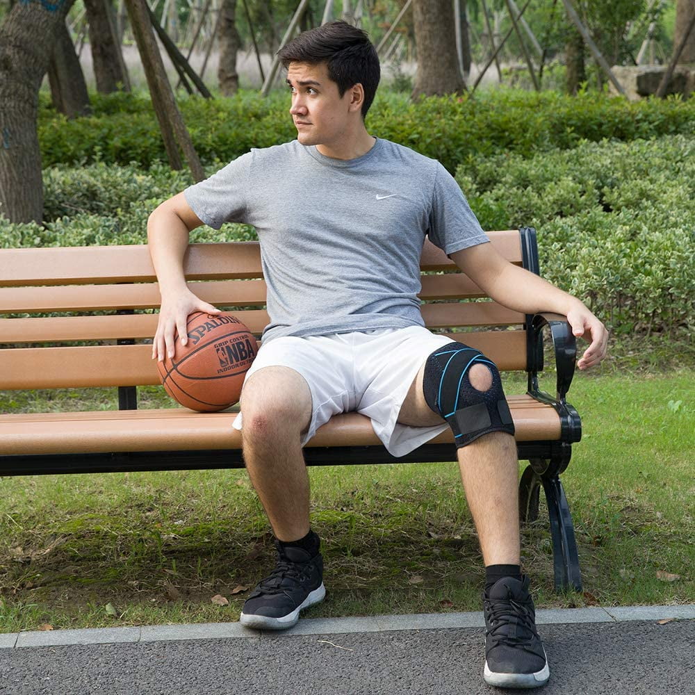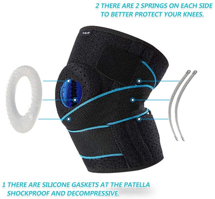 - [Gel pad and spring strips make exercise easier] Insert a medical gel ring in the open patella area to better cover and protect the knee. The double helix metal strips hidden on both sides of the knee pad are soft and elastic, providing sufficient compression and support for the knee and patella. This knee pad with side stabilizer not only protects the knee better, but also saves effort^