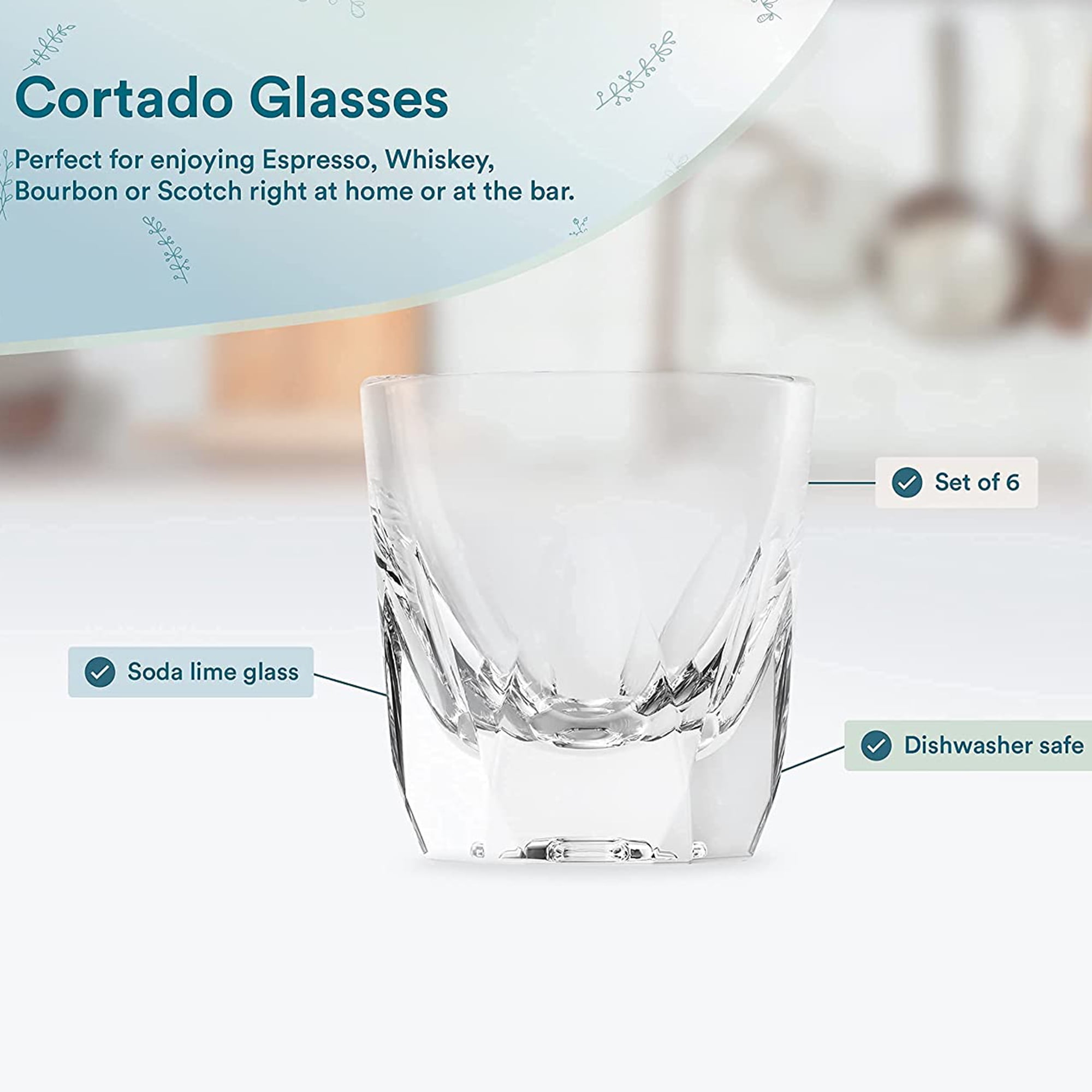 The perfect fusion of sleek design and functionality, these cortado glasses will whisk you off to French bistro heaven. This set of clear drinking glasses is designed to accentuate the aromatic experience and flavor of each brew. The espresso shot glass set is also great as a whiskey glass and scotch glass. These are also suitable for use as bourbon glasses and juice glasses.