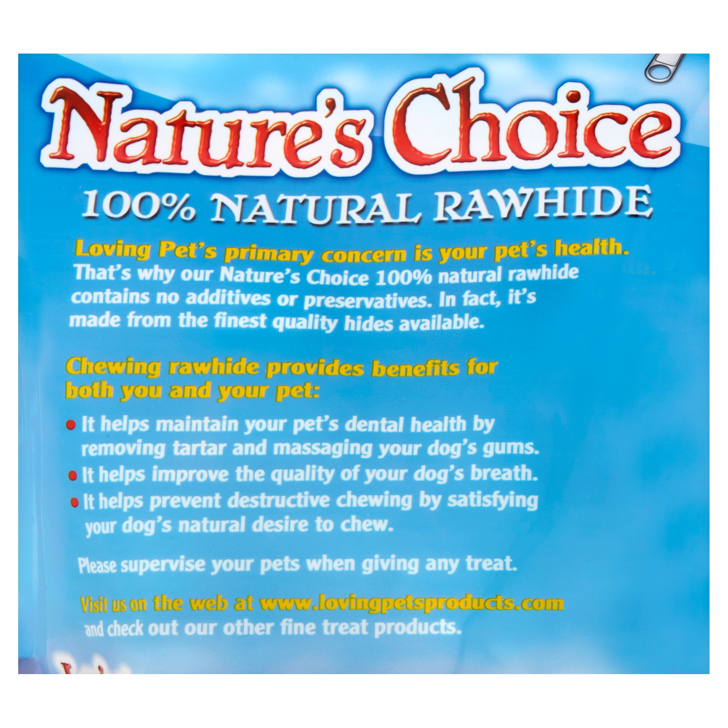 Loving Pet’s primary concern is your pet’s health. Nature’s Choice 100% natural rawhide contains no additives or preservatives. In fact, it’s made from the finest quality hides available. Chewing rawhide helps maintain your pet’s dental health by removing tartar, massaging your dog’s gums and improving the quality of your dog’s breath. It also helps prevent destructive chewing by satisfying your dog’s natural desire to chew. Nature’s Choice Value Packs give you the opportunity to get a large quantity of the rawhide that your dog loves at a great price.