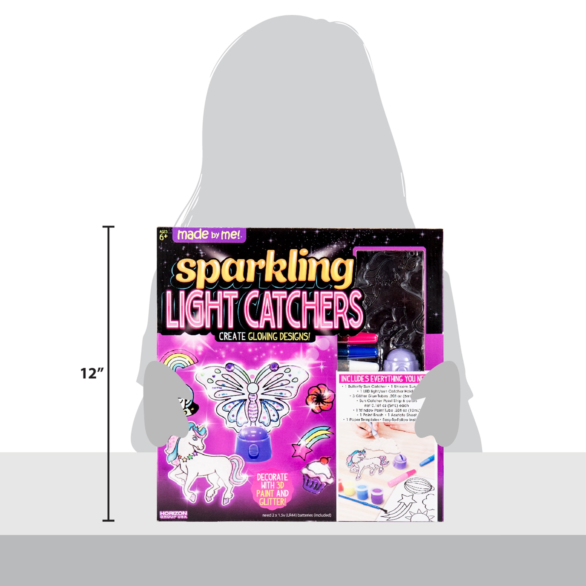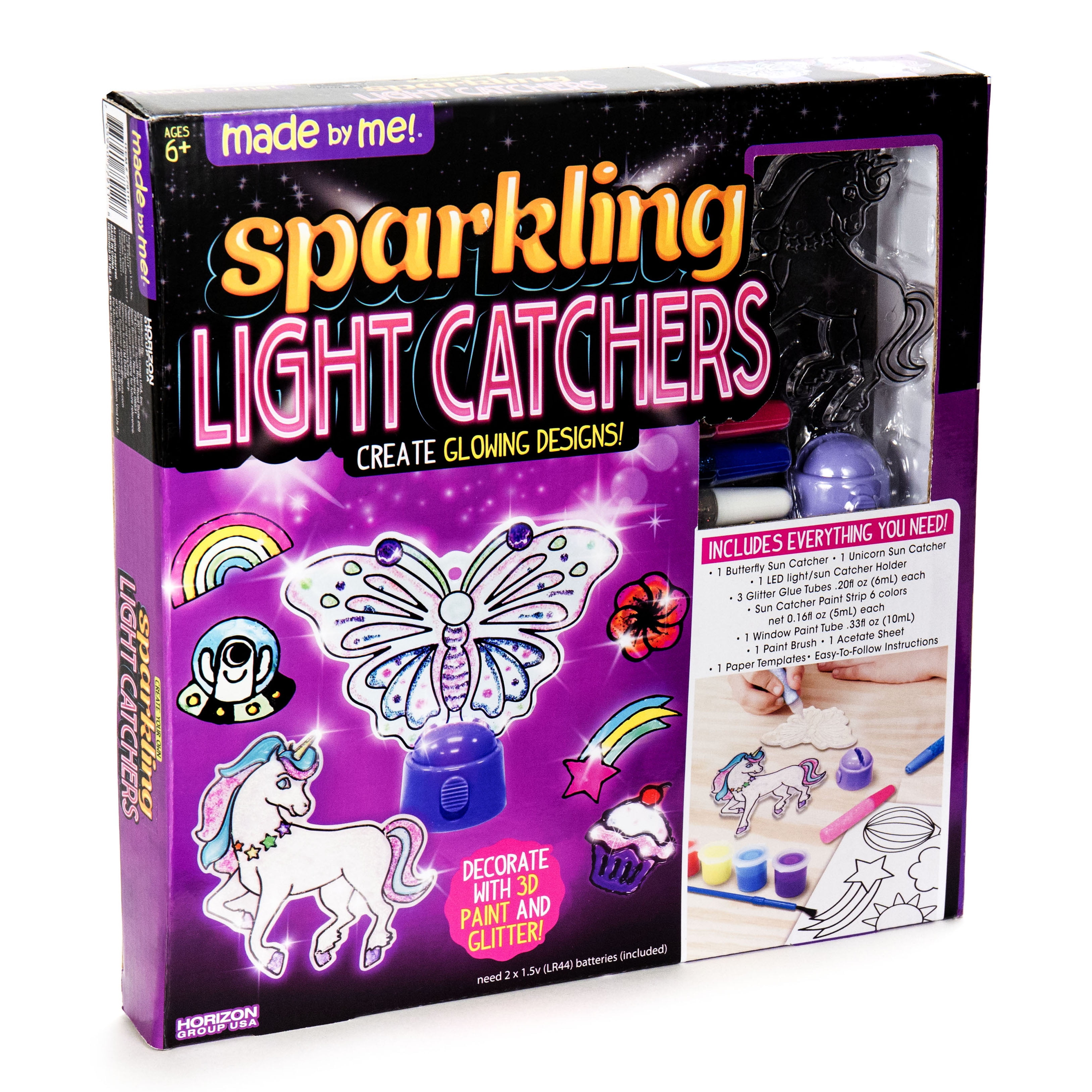 Paint and design artwork that shines with the Made by Me Sparkling Light Catchers! Personalize two mystical sun catcher shapes with vibrant paints and glitter glue for one-of-a-kind creations. When your suncatchers are ready for display, simply slide one of them into the LED light holder and switch it on! Watch as the light makes your sun catcher sparkle! Switch out the designs as often as you’d like. Add a little more sparkle to your life by creating cute window clings! Trace the included template or design your own. Recommended for little artists ages 6 years and up.