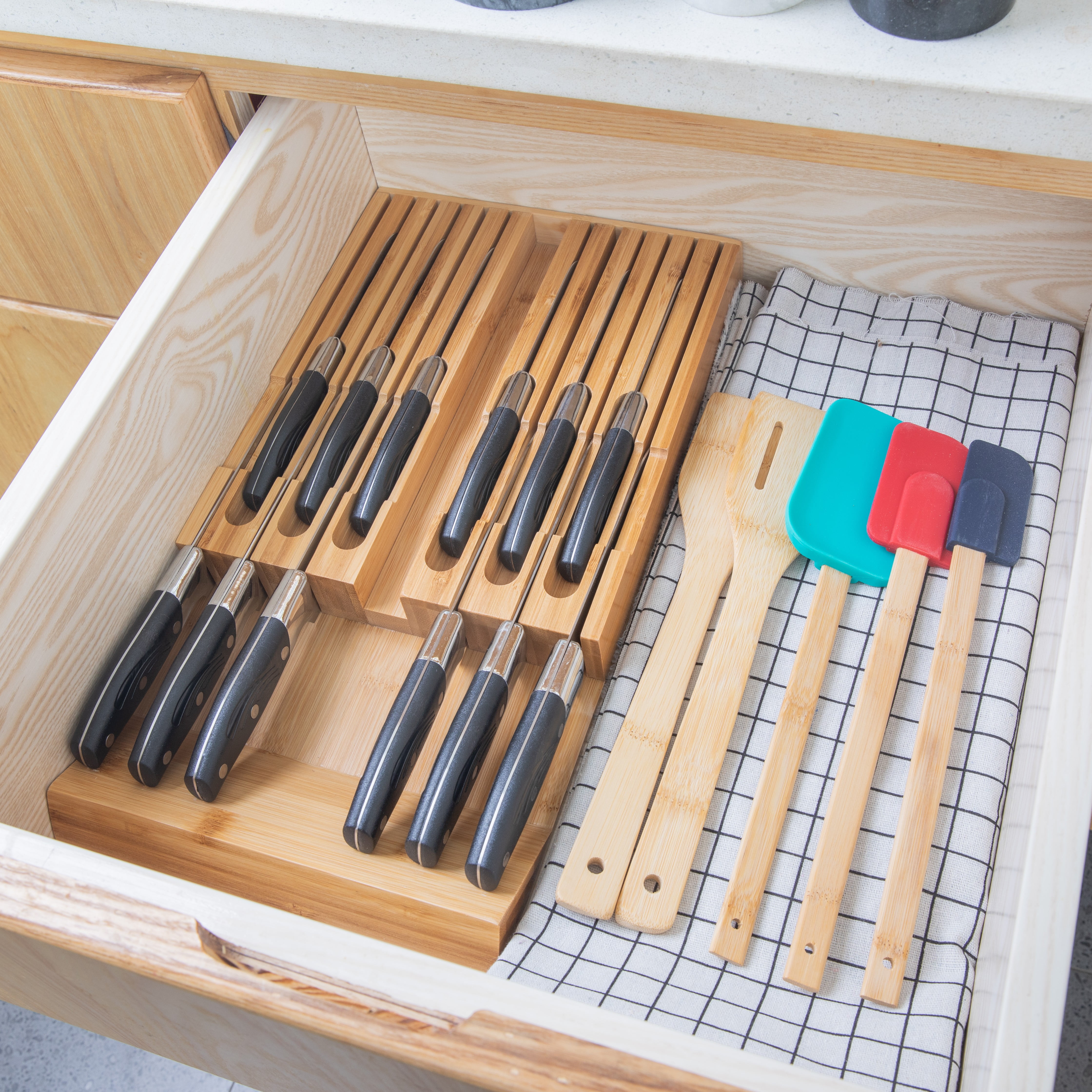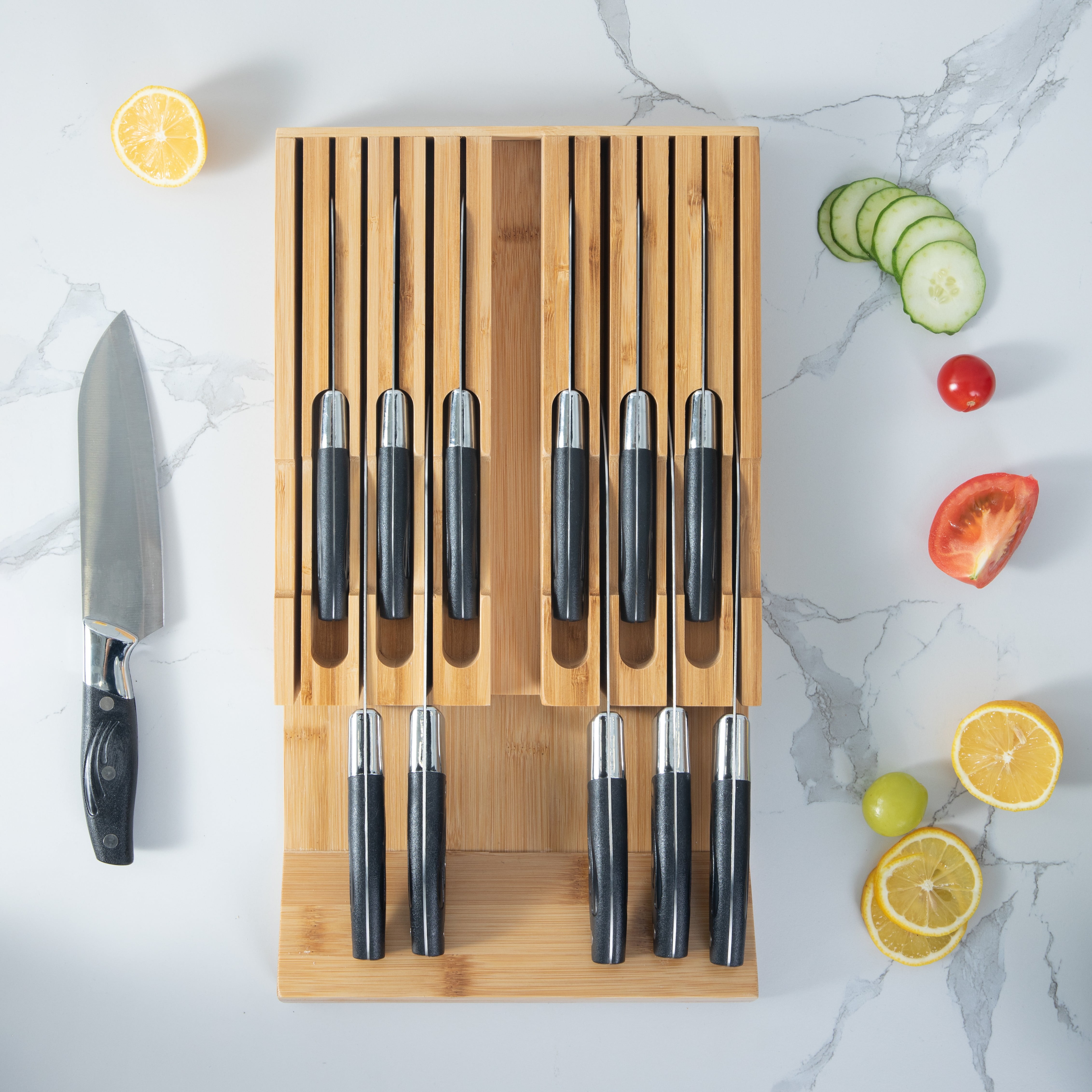 - MORE STABLE. Our knife block can safely protect your drawer and don’t worry about the sliding of the knives. The knives will be held firmly in place.