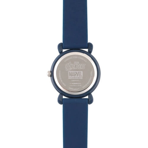 This Marvel’s Avengers: Captain America Boys’ Blue Plastic Time Teacher Watch features a blue silicone strap.