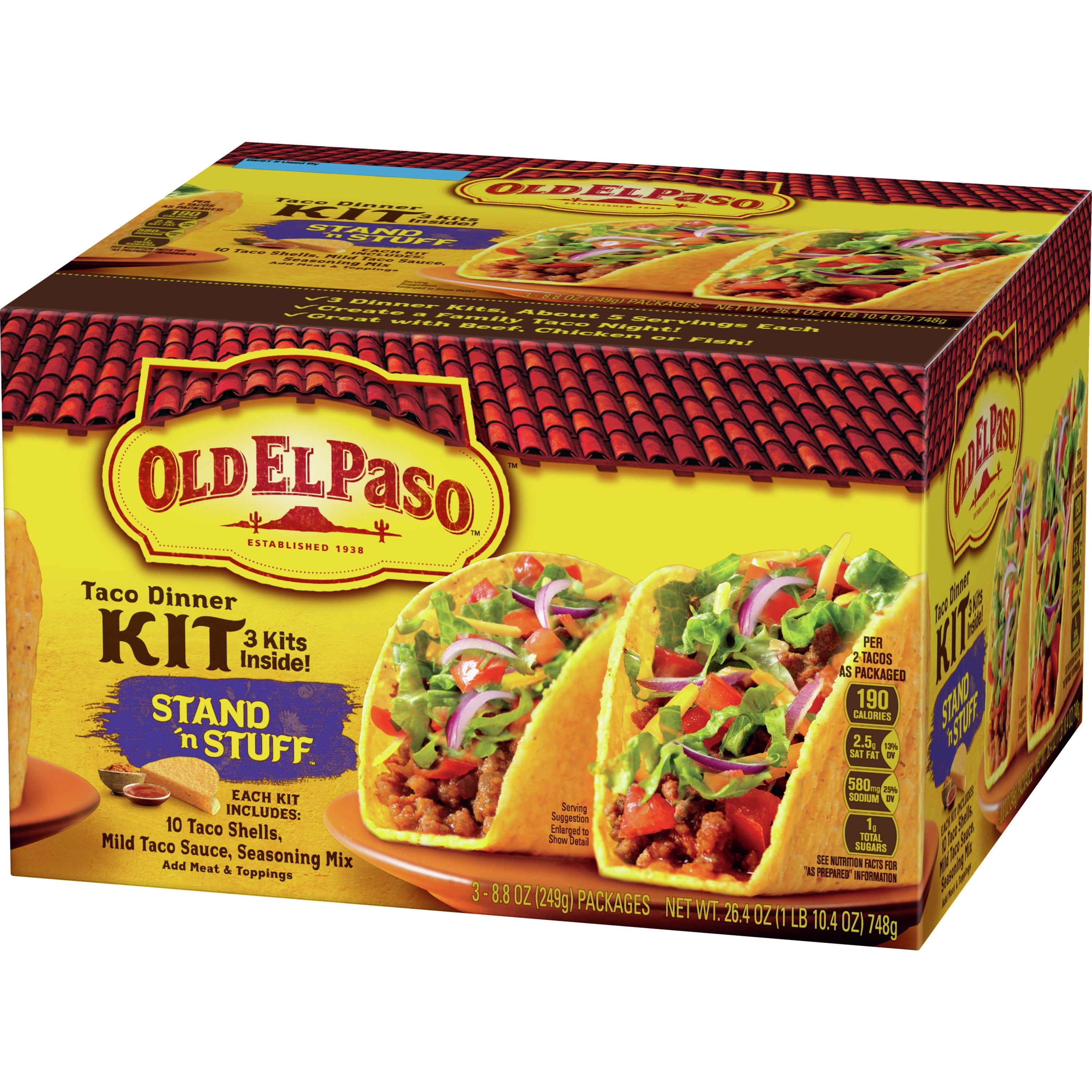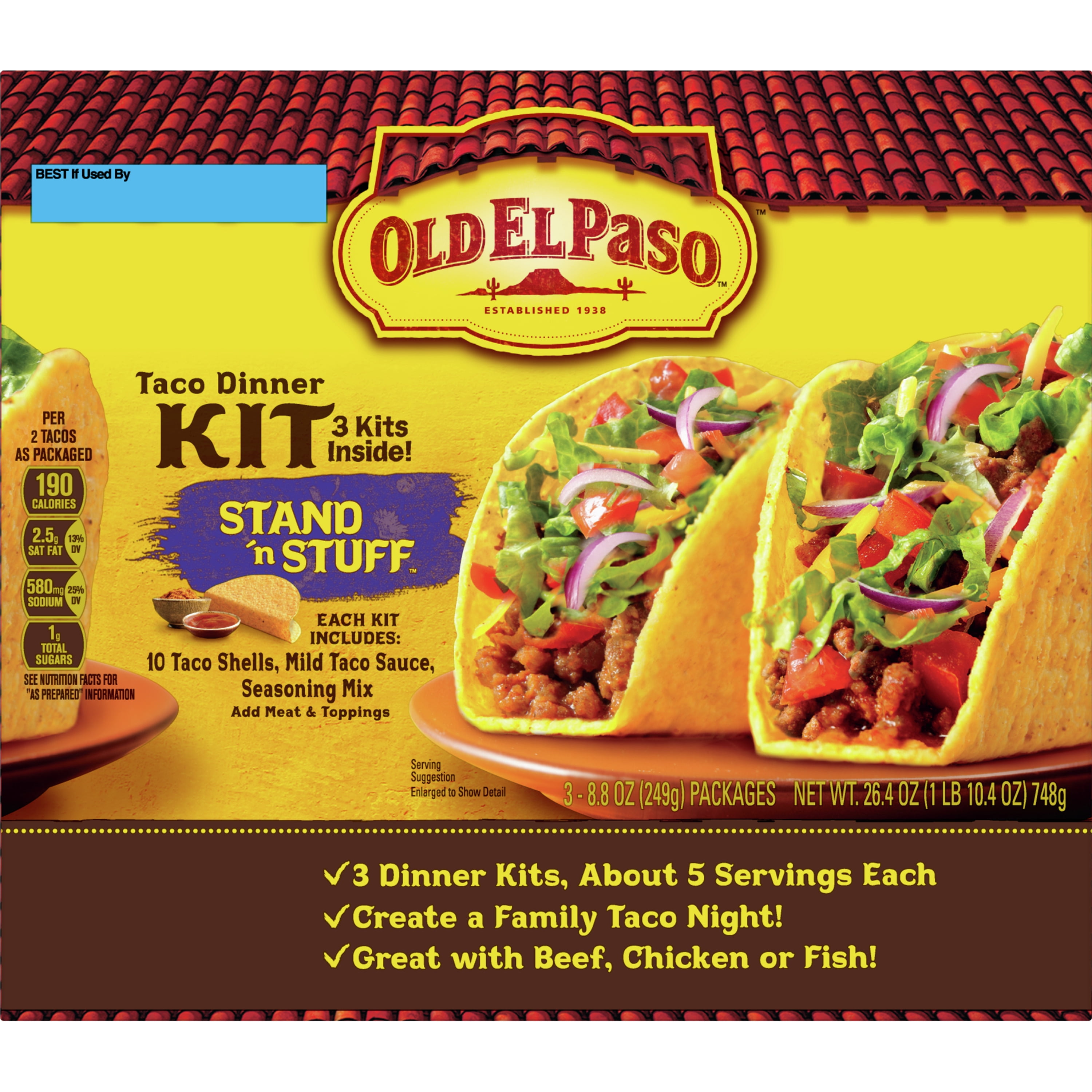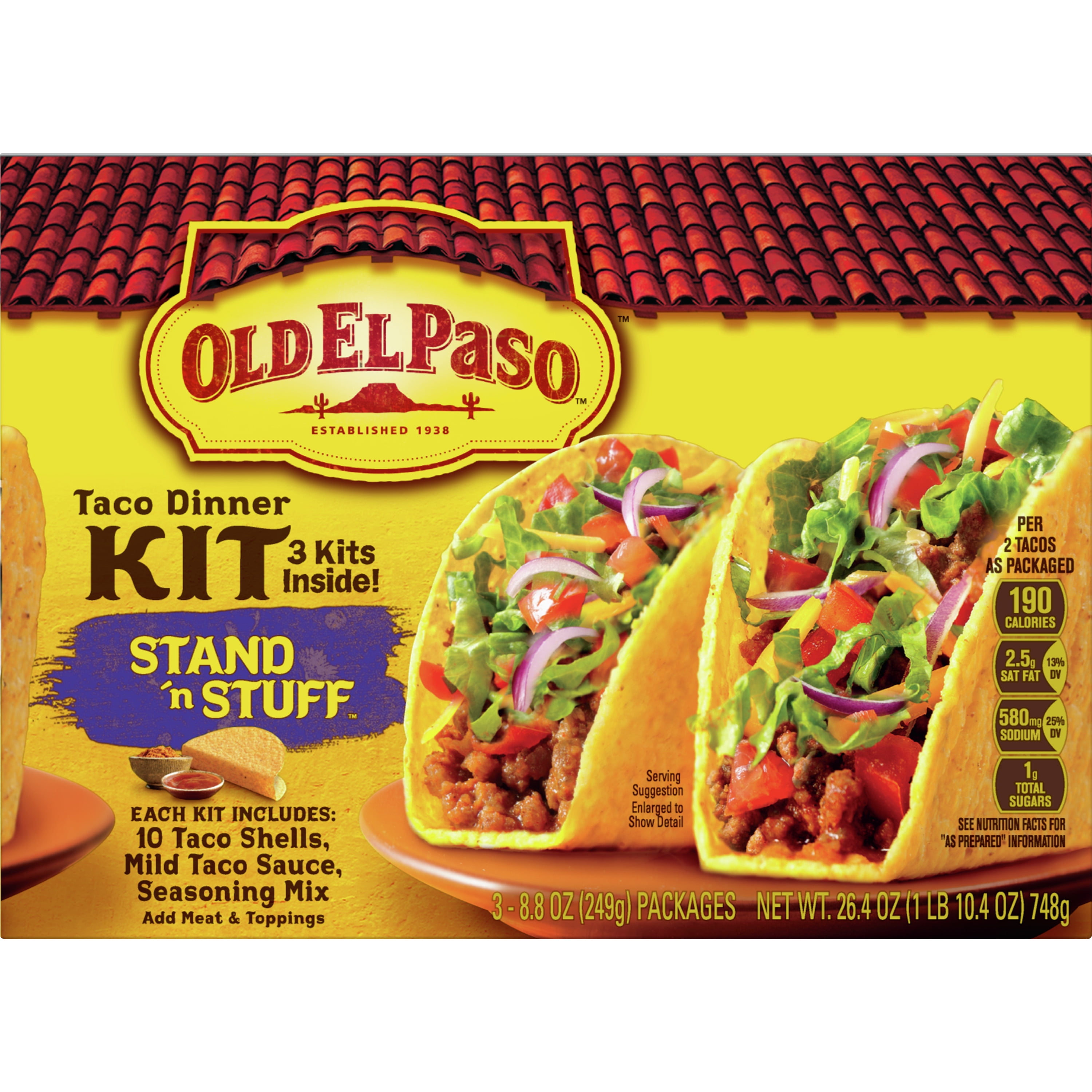Make taco night a stand’n invitation with Old El Paso Stand ‘N Stuff Taco Dinner Kits. This package comes with three taco kits so you can stock the pantry for easy meal prepping. Stand ‘N Stuff Taco Shells have a flat bottom so they stand up on their own. Each taco kit comes with taco sauce and taco seasoning to mix into your chicken, beef or favorite taco fillings. Add your favorite fresh toppings for a taco dinner fiesta ready in about 20 minutes!For more than 80 years, Old El Paso has been bringing families and communities together to celebrate old and new traditions around delicious, Mexican-inspired flavors. We believe that any night can be a taco night, and we’re here to help make it a little easier and a lot more delicious. Our variety of crispy hard taco shells, tasty soft tortillas, flavorful seasonings, and much more help make taco night fun.