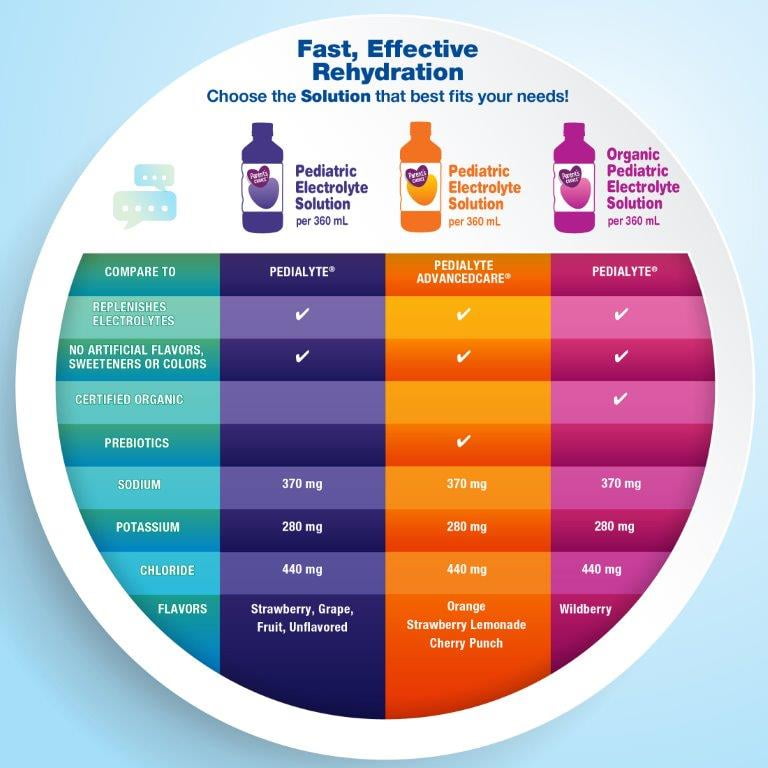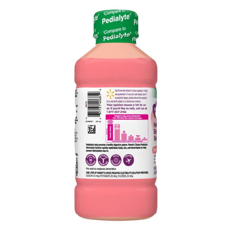 Compare to Pedialyte AdvancedCare. Use Parent’s Choice Strawberry Lemonade Pediatric Electrolyte Solution for those times when illness, exercise, heat exhaustion or travel create a need for rehydration and to help prevent dehydration. Our formulation features PreVital Prebiotics to help promote digestive health. No artificial flavors, sweeteners or synthetic colors. Recommended by pediatricians and pharmacists. Helps prevent dehydration more effectively than sports drinks, sodas, juices and water. Strawberry Lemonade natural flavor, with other natural flavor. Pedialyte and Pedialyte AdvancedCare are registered trademarks of Abbott Laboratories. This product is not manufactured or distributed by Abbott Nutrition, Abbott Laboratories, the distributor of Pedialyte and Pedialyte AdvancedCare. Prevital is a registered trademark of PBM Nutritionals, LLC. Advantage is a registered trademark of PBM Products, LLC.
