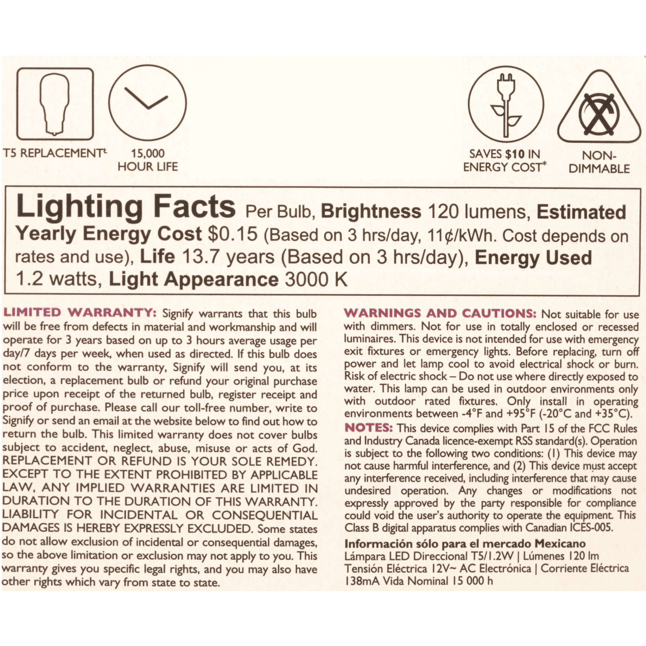 Philips LED T5 accent light bulbs provide 120 lumens of bright, crisp white light equivalent to 7-watt halogens at 1/6 of the energy consumption. Ideal for accent lighting, these bulbs have G4 Bi-Pin bases. Not for use with Philips HUE products. Perfect landscape lighting, these capsule light bulbs offer crisp, bright white light at 3000-kelvin with excellent color rendering in any setting. These LEDs turn on instantly with clear, steady flicker-free light. Use with wedge base fixtures. The bulbs also offer a removable lens for an easy fit in small fixtures. At 1.2-watts, these bulbs use 1/6 the energy of 7-watt equivalent halogen bulbs to save money and serve the environment. Philips LEDs are mercury free. Extra long-lasting, each bulb in this pack of 2 Philips T5 LEDs has an expected lifespan of 15,000 hours—that’s over 12 years based on usage rates of 3 hours per day.
