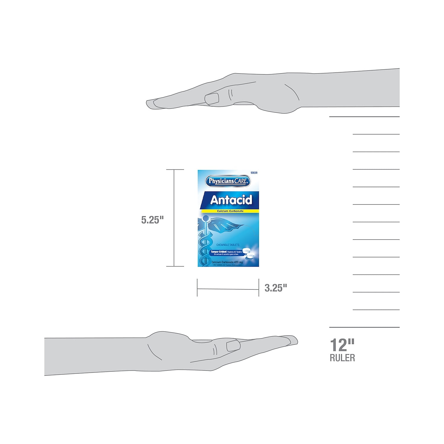 Make indigestion relief available for your staff with these PhysicianCare antacid heartburn medication two-tablet 420-milligram packets.Keep first aid kits stocked with these PhysicianCare antacid heartburn medication packets. Each dose is individually sealed for safety, and the box doubles as a dispenser. The easy-to-swallow tablets are formulated with calcium carbonate as the active ingredient to help relieve heartburn, acid indigestion, sour stomach and upset stomach. Keep these PhysicianCare antacid heartburn medication packets in the office break room, reception desk or employee lounge for easy access whenever your staff needs it. Regular Strength chewable antacid tablet. Active ingredient: calcium carbonate 420mg. 50 dozes in individually sealed packets containing 2 tablets each. All PhysiciansCare brand medications are gliadin (wheat) gluten-free. Perfect for standalone first aid or as a refill for a kit. Sold as 50/Box.
