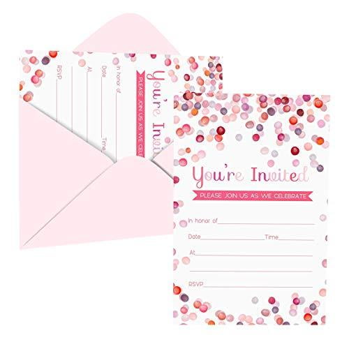 Pink Confetti Invitation and Envelope Pack of 15 Blank Invite Set for Girls Baby Shower, Birthday, Teens, Kids, Special Events Watercolor Dot Design Printed 4×6 Paper Clever Party