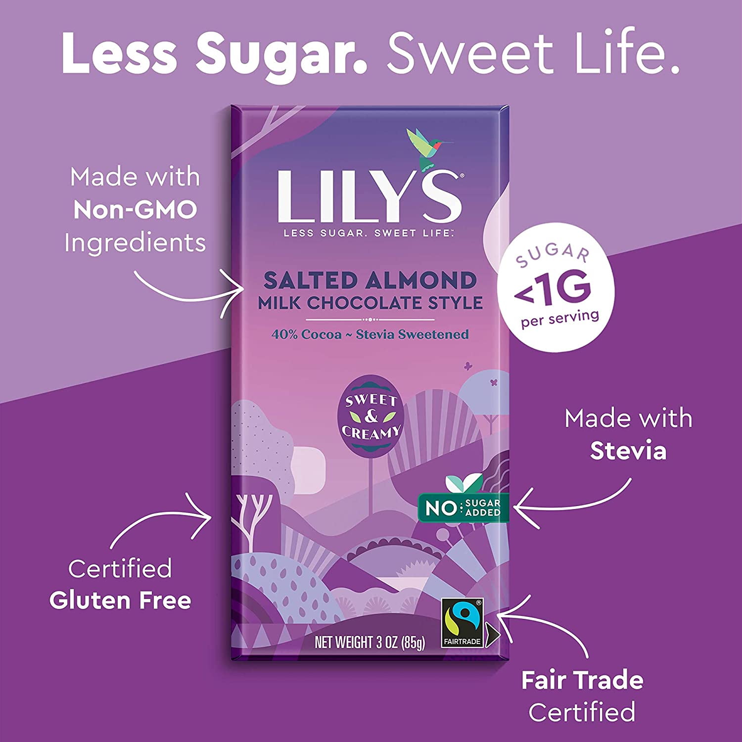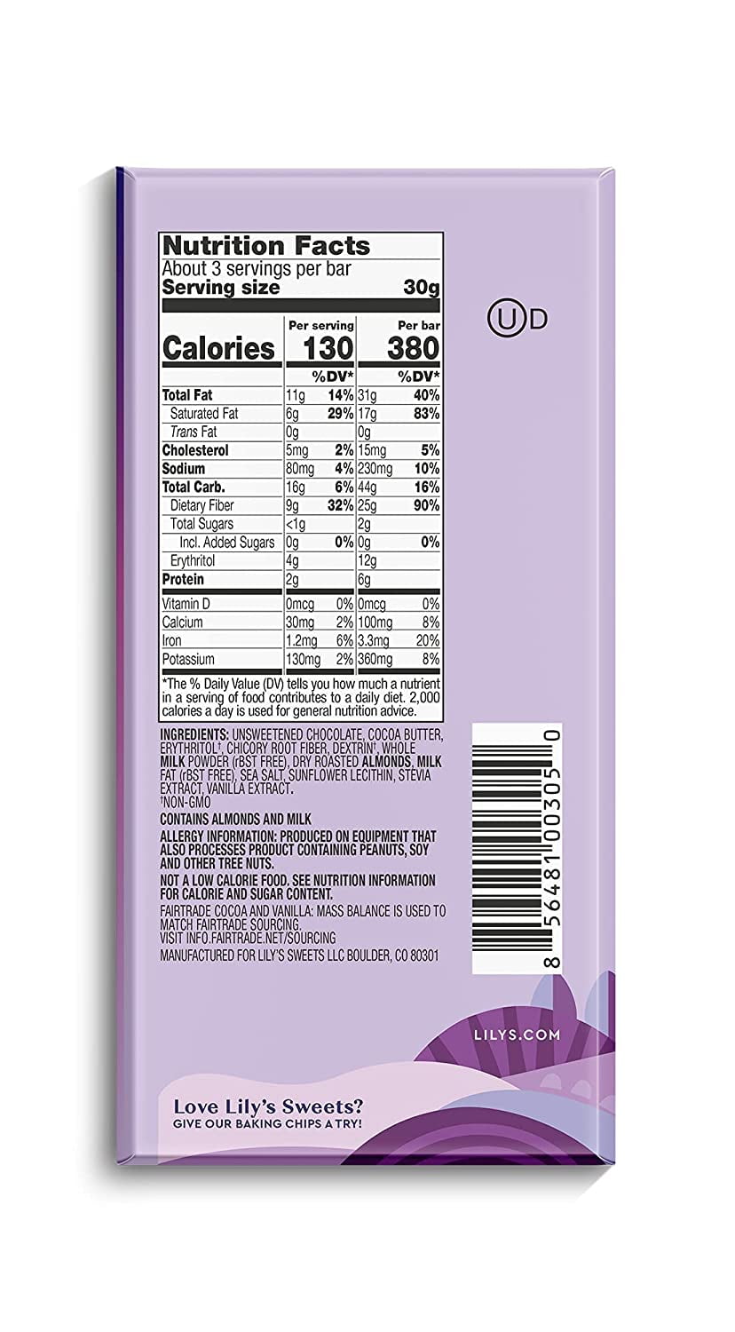 Low carb, Keto friendly premium milk chocolate style bar (40% Cocoa) Made with Stevia – Stevia is a zero calorie botanical sweetener. It is derived from the plant Stevia Rebaudiana. The stevia used in Lily’s chocolate is a stevia extract. Our use of Stevia gives Lily’s natural a richness and less sugar than typical chocolates. Use of Fair Trade, Gluten-Free and Non-GMO Ingredients 3 Net Carbs per Serving