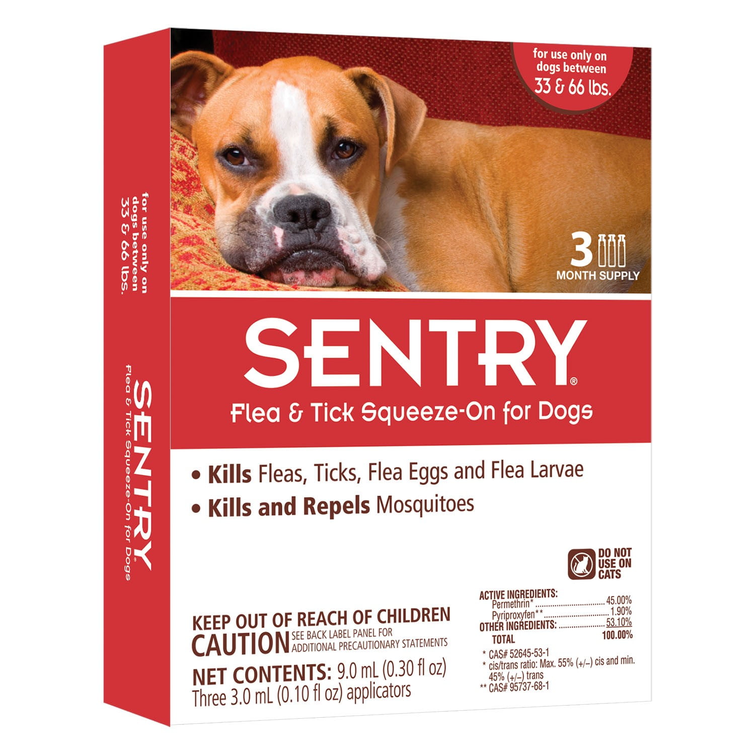 Take control of pests with a proven topical! Sentry Flea and Tick Squeeze-On for dogs kills and repels fleas and ticks for up to one month. It also kills flea eggs and larvae for up to four months. It even kills and repels mosquitoes!
