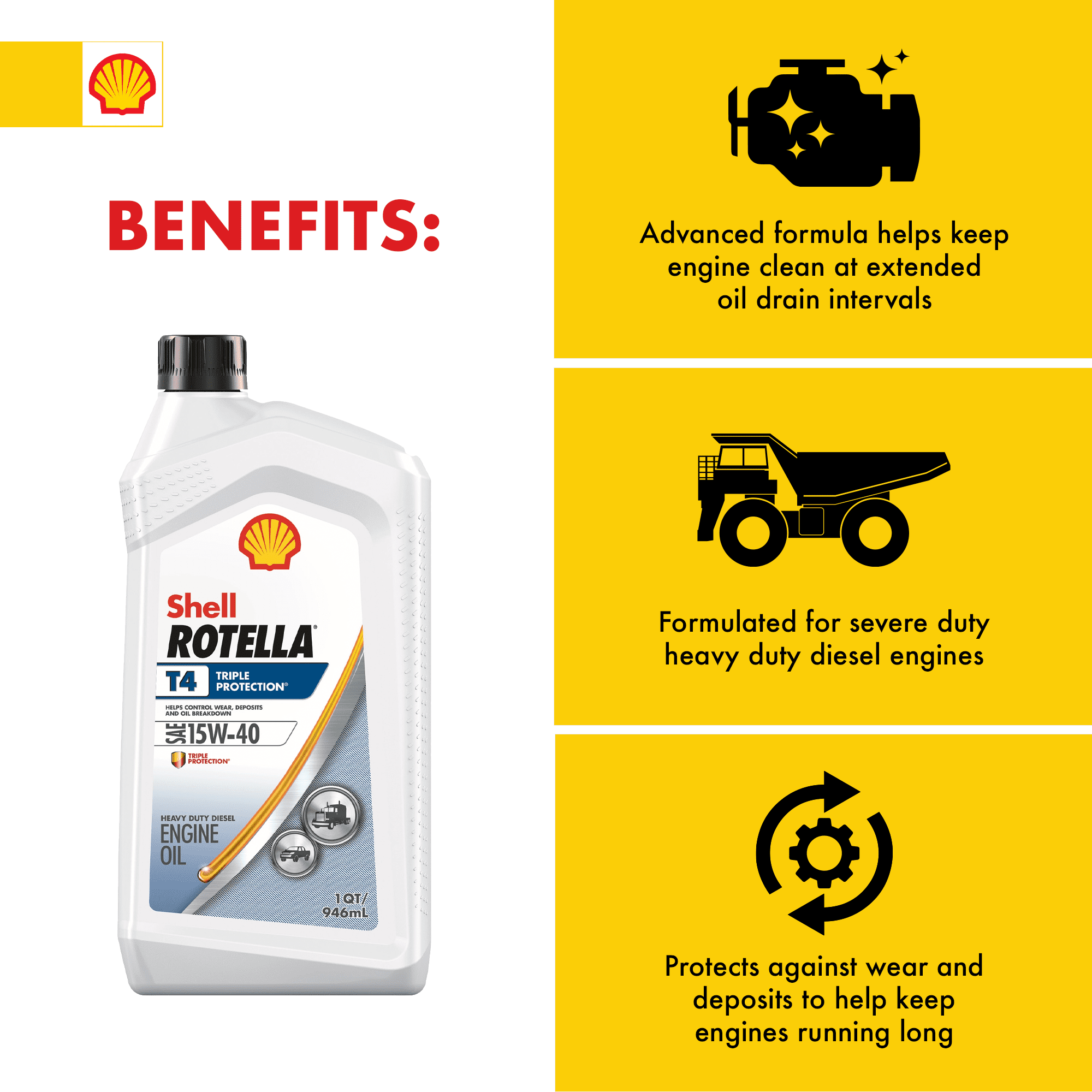 Shell Rotella T4 Triple Protection 15W-40 is an excellent choice for on-highway fleets, general haul, construction, agriculture, public-transport operators, diesel pickup trucks, including high-power vehicles where resistance to increased heat and stress is required.