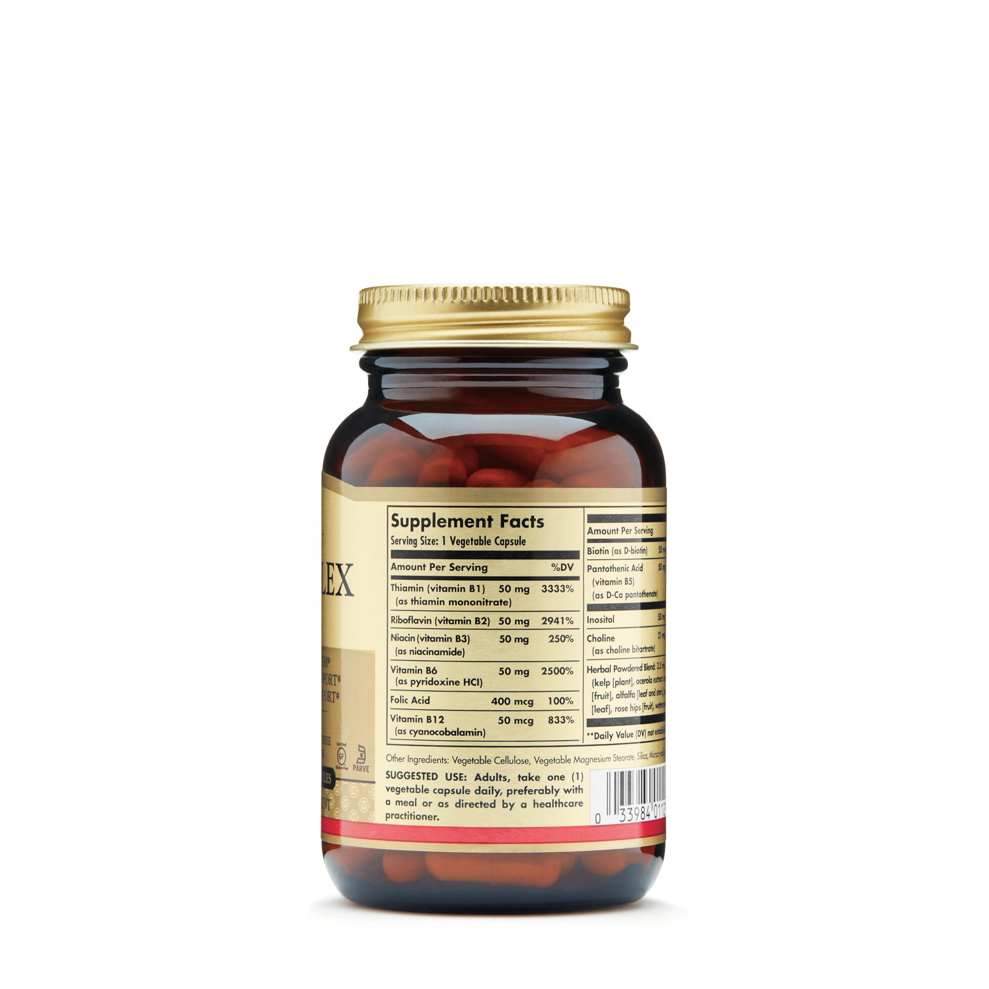 Formula B-50 100 VegCapProduct DescriptionB Complex vitamins are needed for the metabolism of carbohydrates, fats and proteins, which convert food into energy.Suggested Use As a dietary supplement take one 1 to two 2 vegetable capsules daily, preferably at mealtime – Or as directed by your healthcare professional.Supplement FactsServing Size 1 VegCap Servings Per Container 100 Amount Per Serving% Daily Value***Thiamin vitamin B1 as thiamin mononitrate 50 mg 3333% Riboflavin vitamin B2 50 mg 2941% Niacin vitamin B3 as niacinamide 50 mg 250% Vitamin B6 as pyridoxine HCI 50 mg 2500% Folic Acid 400 mcg 100% Vitamin B12 as cobalamin 50 mcg 833% Biotin as D-biotin 50 mcg 17% Pantothenic Acid vitamin B5 as D-Ca pantothenate 50 mg 500% Inositol 50 mg Choline as choline bitartrate 21 mg Natural Powdered Blend kelp plant, acerola fruit, alfalfa plant, parsley aerial, rose hips fruit, watercress plant 3.5 mg ***Percent Daily Values are based on a 2,000 calorie dietOther Ingredients Vegetable Cellulose, Vegetable Magnesium Stearate, Silica, Microcrystalline Cellulose.Does Not Contain Gluten, Wheat, Dairy, Soy, Yeast, Sugar, Sodium, Artificial Flavor, Sweetener, Preservatives and Color.Warnings Keep out of reach of children. As with all dietary supplements, consult your healthcare professional before use. See product label for more information.Solgar – B-Complex 50 – 100 Vegetarian Capsules Solgar B-Complex "50". Each required nutrient in the Vitamin B Complex performs a unique role in maintaining proper metabolic functioning, while nutritionally supporting the body during the stress of daily living. B Complex vitamins are needed for the metabolism of carbohydrates, fats and proteins, which convert food into energy. In addition, these vitamins play a necessary role in supporting cardiovascular health, the promotion of a healthy