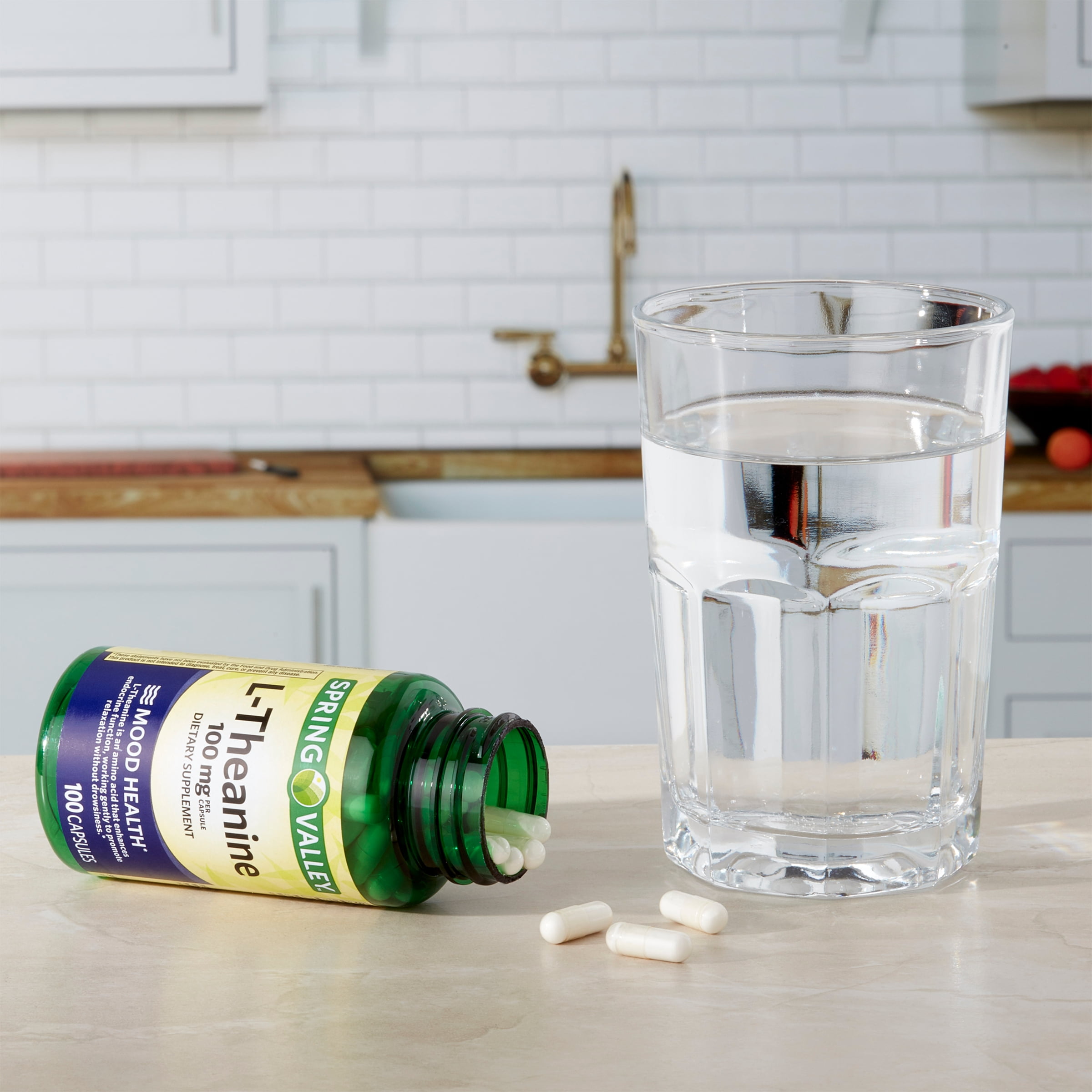 Our Spring Valley L-Theanine Capsules Dietary Supplement, 100 mg is formulated to support mood health.* Each capsule delivers 100 mg of L-theanine. L-theanine is an amino acid that enhances endocrine function, working gently to promote relaxation without drowsiness.* You can rest assured that Spring Valley L-Theanine Capsules Dietary Supplement, 100 mg is produced with strict quality guidelines and is backed by our quality guarantee.